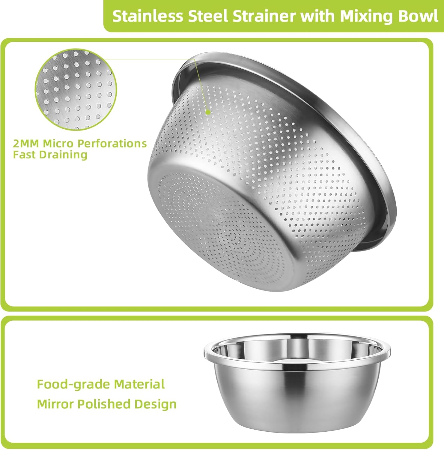 - SUITABLE KITCHEN DIMENSION: Holds 5 quart items. The combination of the stainless steel strainer and mixing bowl makes it easy to clean and prepare food, becoming an indispensable tool in your kitchen