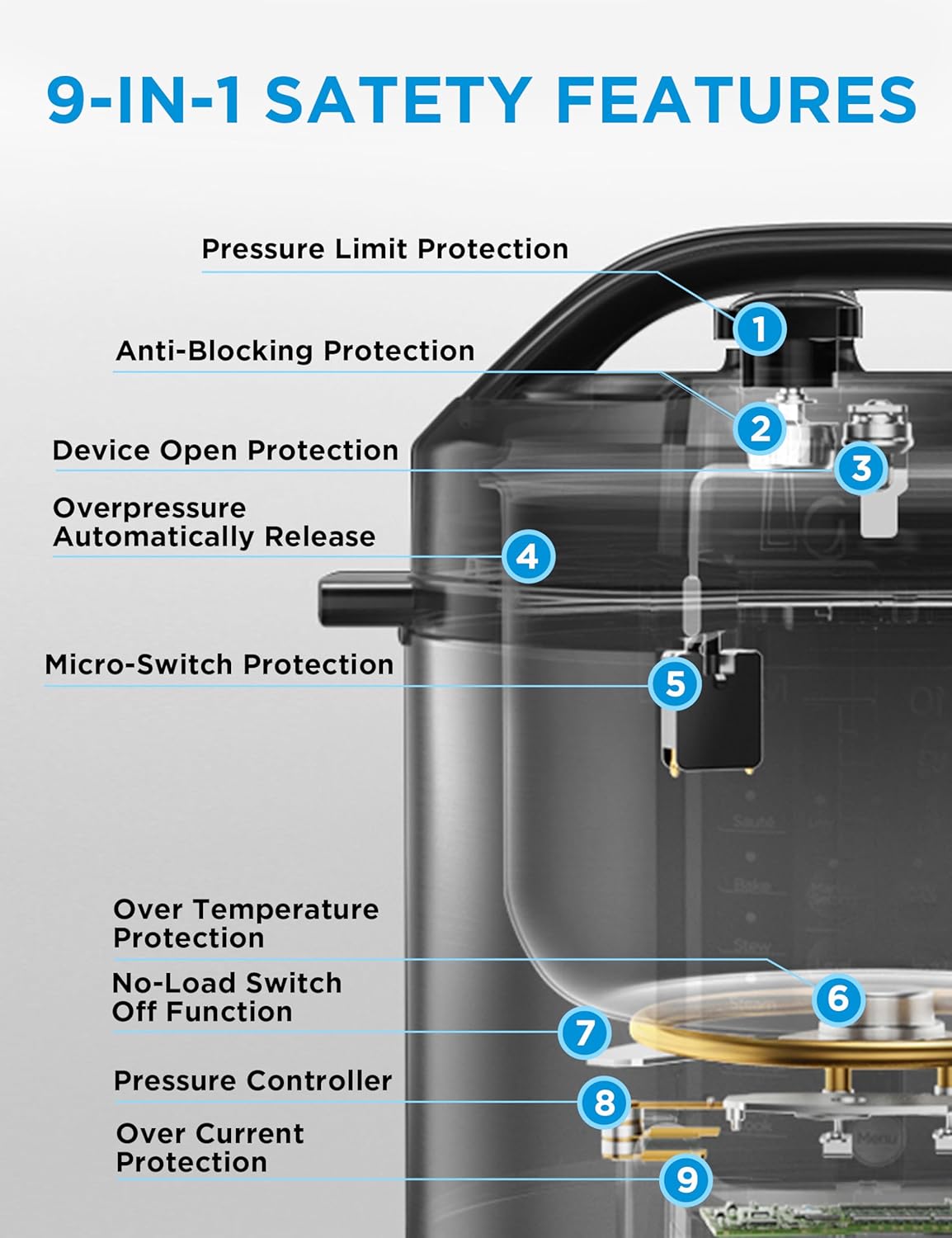 - Advanced Protection: Equipped with the advanced REALSAFE SYSTEM, this 9-in-1 safety protection features pressure limit, over temperature, and overpressure automatic release, so you can cook with peace of mind.