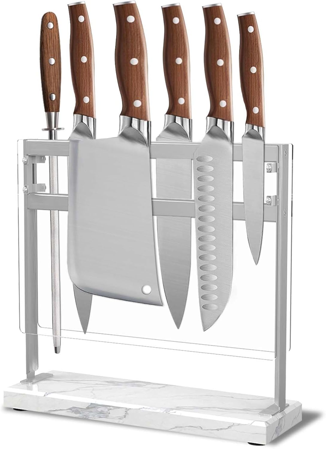 Magnetic Knife Stand Block with Marble Base, Double-sided Stainless Steel Magnets for Countertop with Acrylic Shield, Magnetic Knife Holder for Kitchen Storage, 12 IN, White