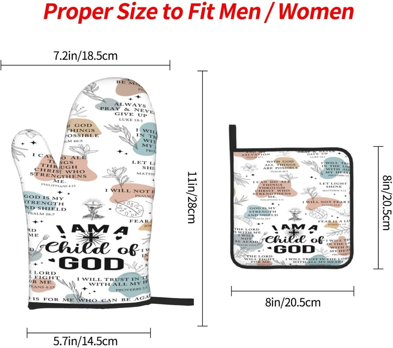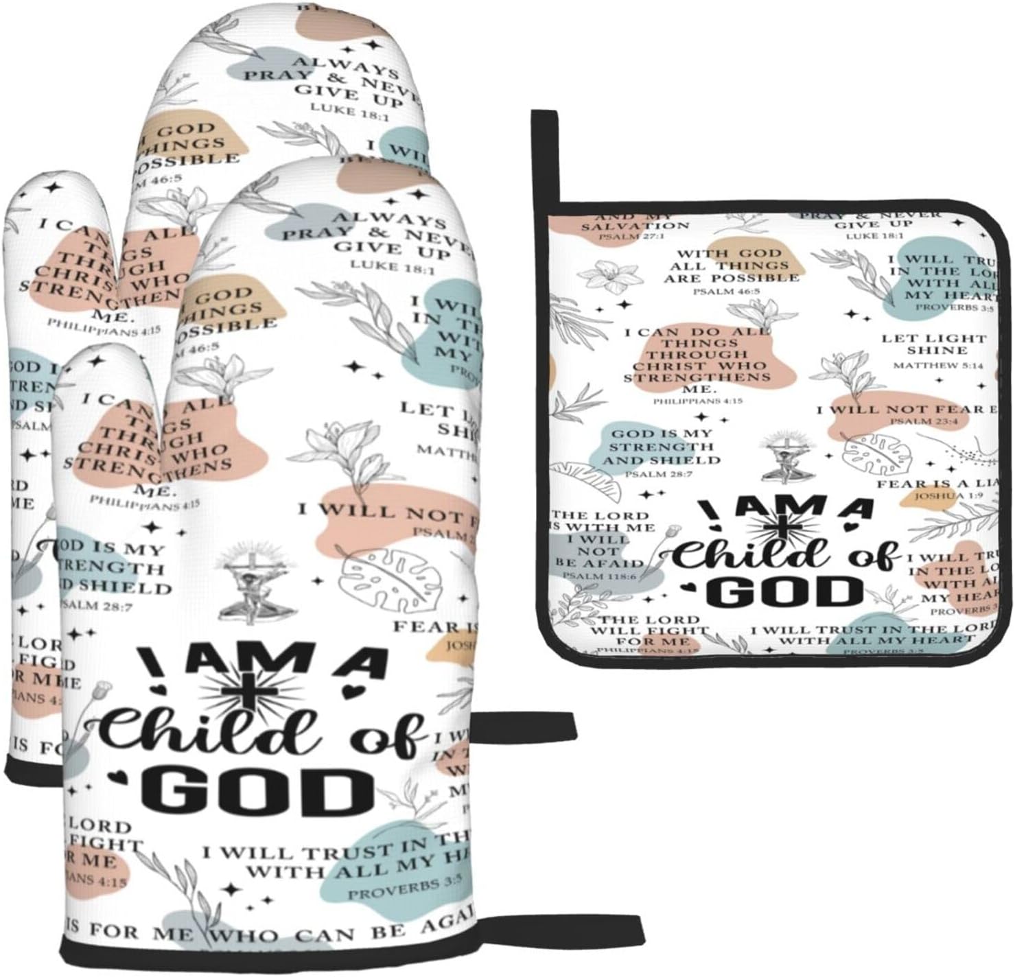- Material: Christian pot holders and oven mitts sets include 2 baking gloves and 1 pot pads. I'm a child of god kitchen oven mitts are made of heat resistant polyester fabric, soft quilted cotton lining making, non-slip, heat resistant