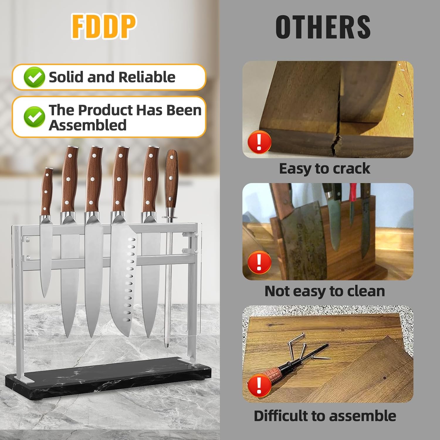 - 【Food-Grade Stainless Steel: Durable and Easy to Clean】 Crafted from high-quality food-grade stainless steel, this knife holder is rust-resistant, free from grime buildup, and protects your knife blades from damage. A quick wipe restores its shine, keeping it hygienic and ready for daily use, making it a reliable and long-lasting addition to your kitchen.
