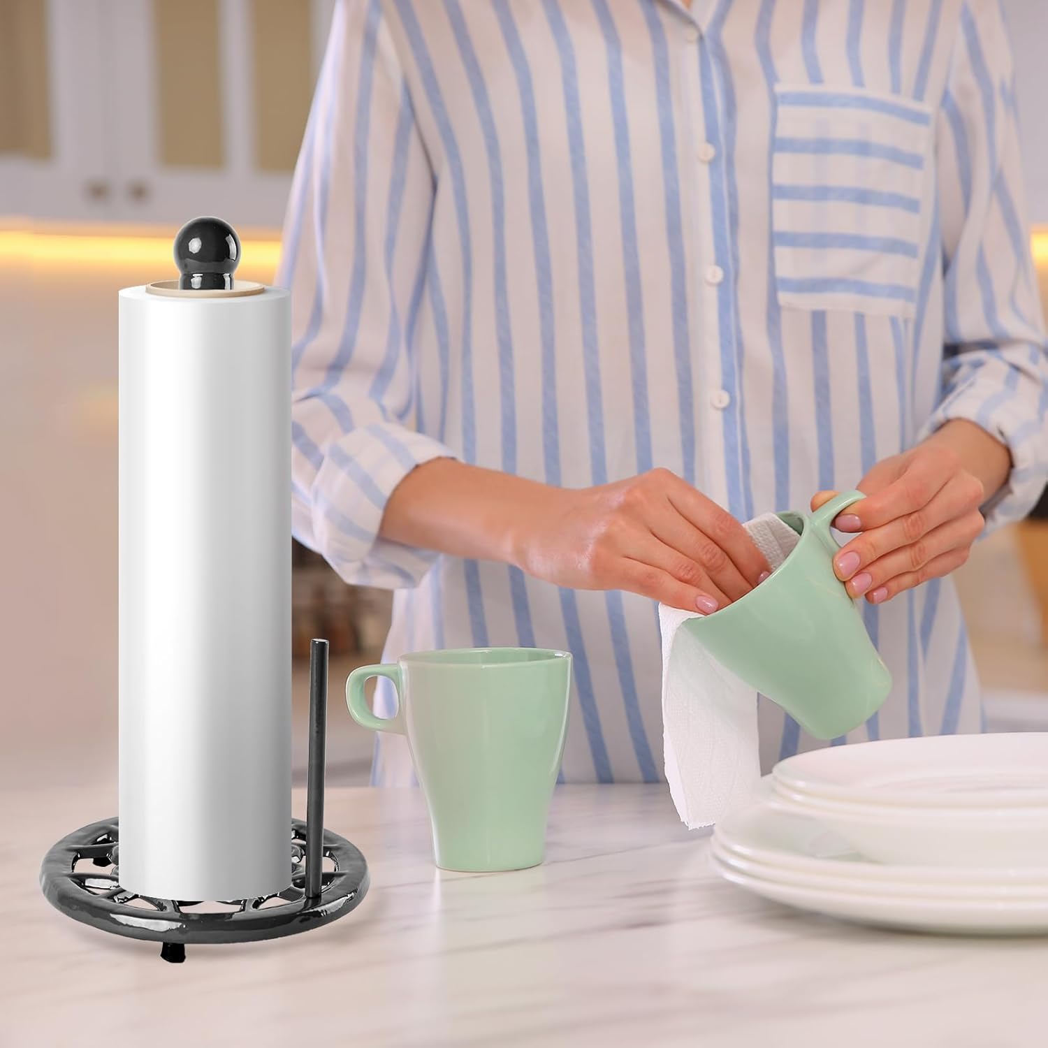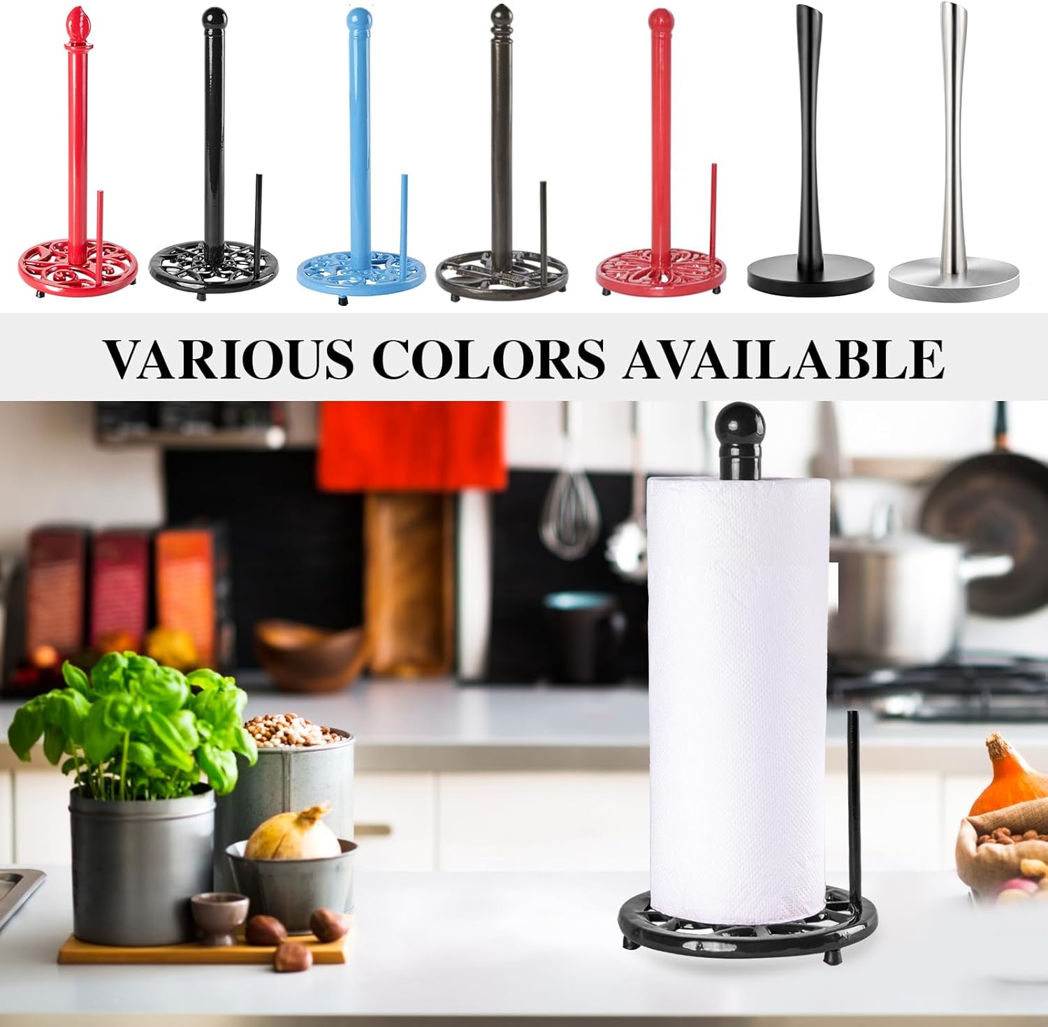 - Sturdy & Stable: Metal paper towel holder made of cast iron material which is Rustless, Fastness, Wear-resistant, Heat-resistant, Stable shape, Strong tension, Anti-aging, and Long service life. Wipe clean with a damp cloth