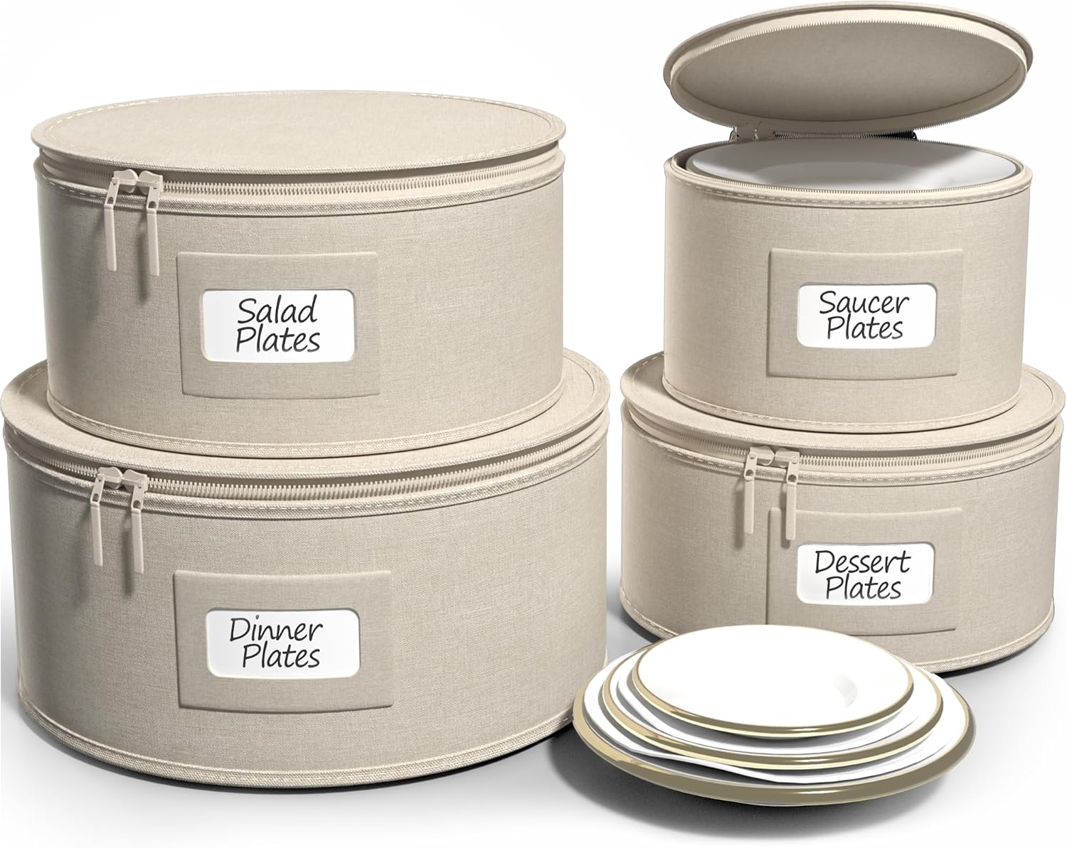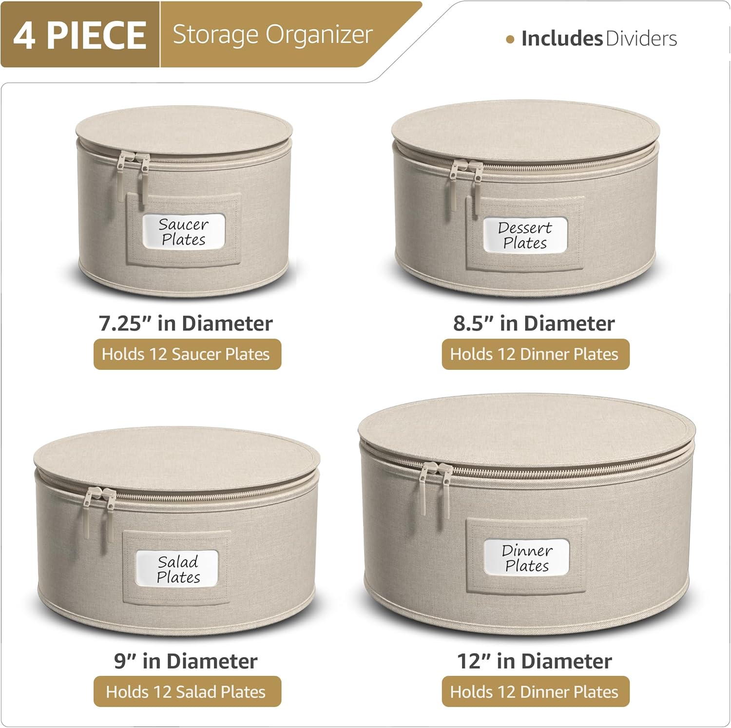 - Sorbus China Dinnerware Storage 4 Piece: Store and organize Christmas dinnerware & accessories and fine china with this quilted 4 Piece china storage case set - Approximate Measurements Round Dinner Plate Case 12β D x7.5β H, Salad Plate Case 9β D x6 β H, Dessert Plate Case 8.5β D x 5.5β H, Saucer Plate Case 7.25β D x 5.25β H C- Each case includes a content label window to insert your own label to quickly identify contents inside