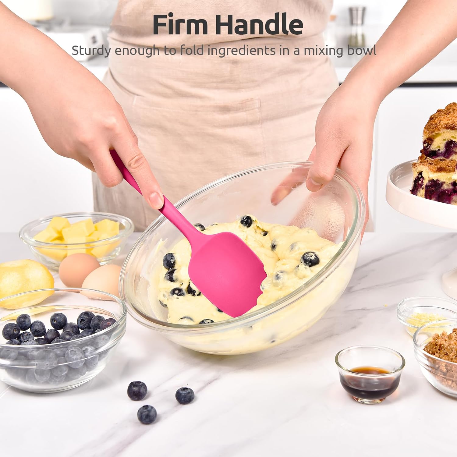 - [Sturdy Enough with Upgraded Core to Fold Ingredients in a Mixing Bowl] The handle of U-Taste baking spatula is firm all the way up to the center of the tool, with the softening increasing out to the edge. We upgraded the core so the cooking spatula doesn't bend through the handle and cause it to collapse and the core won't come through the mixing spatula. It's strong enough to stir thick mashed potatoes and fold blueberries into a coffee cake.