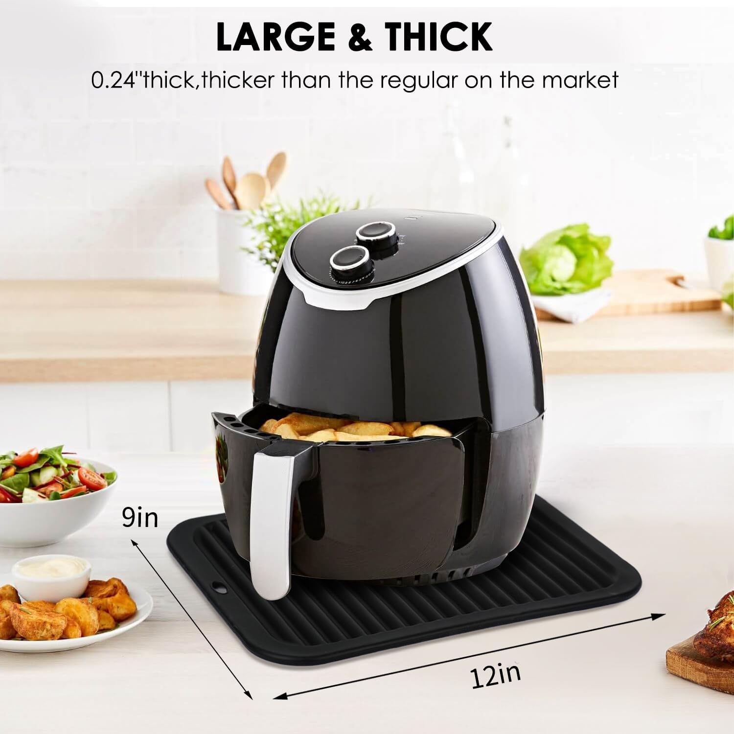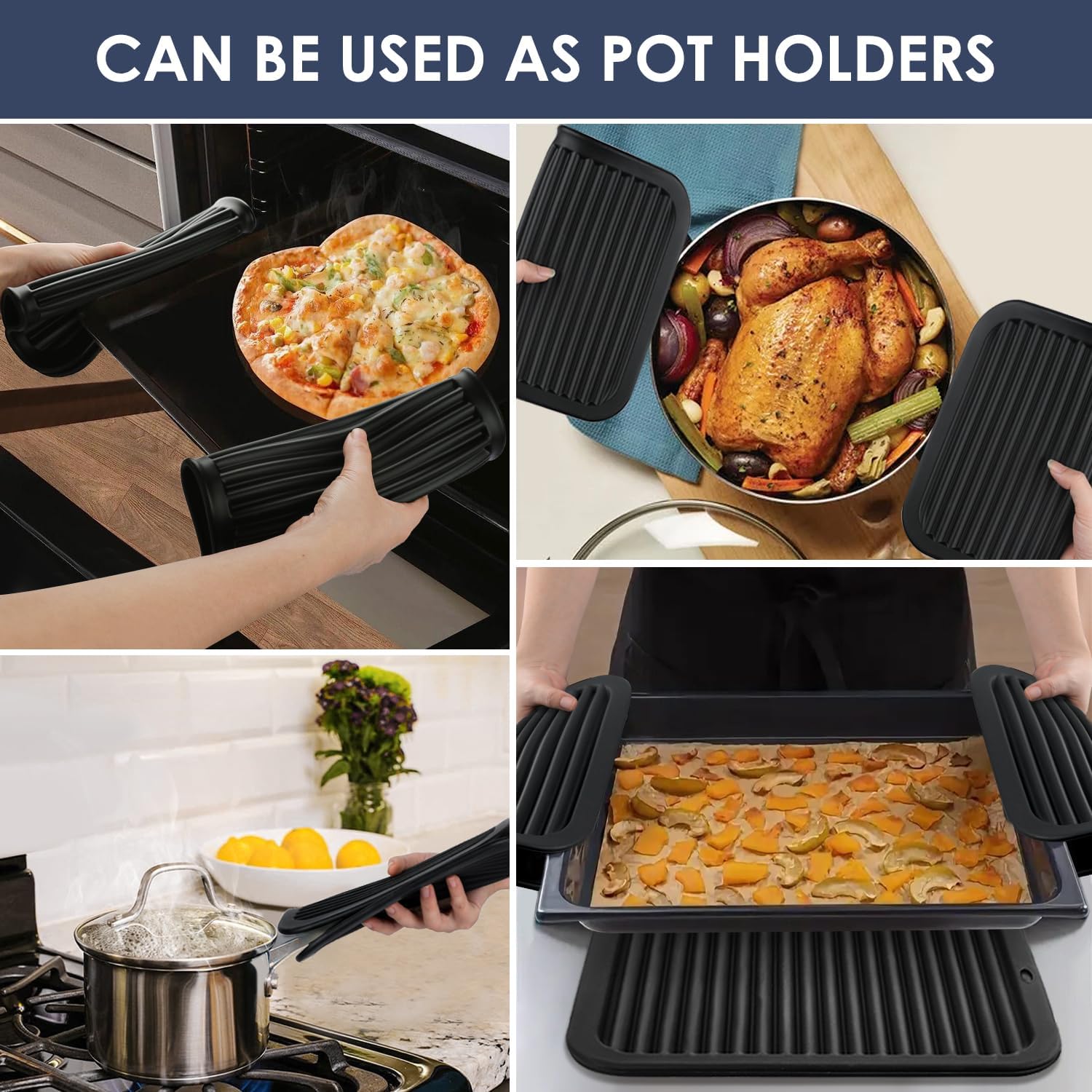 - 🥘Food-grade Silicone & Perfect Size: Our large black kitchen hot pads are made from 100% food grade silicone, BPA-free, leak-proof, nonstick, and lightweight. The 4 pack black silicone mat are super easy to grab a hot pan or dish. Size 9x11.6 inches, large enough for 9x13'' pans. And the black pot holders are perfect for air fryers and one other appliance that creates heat.