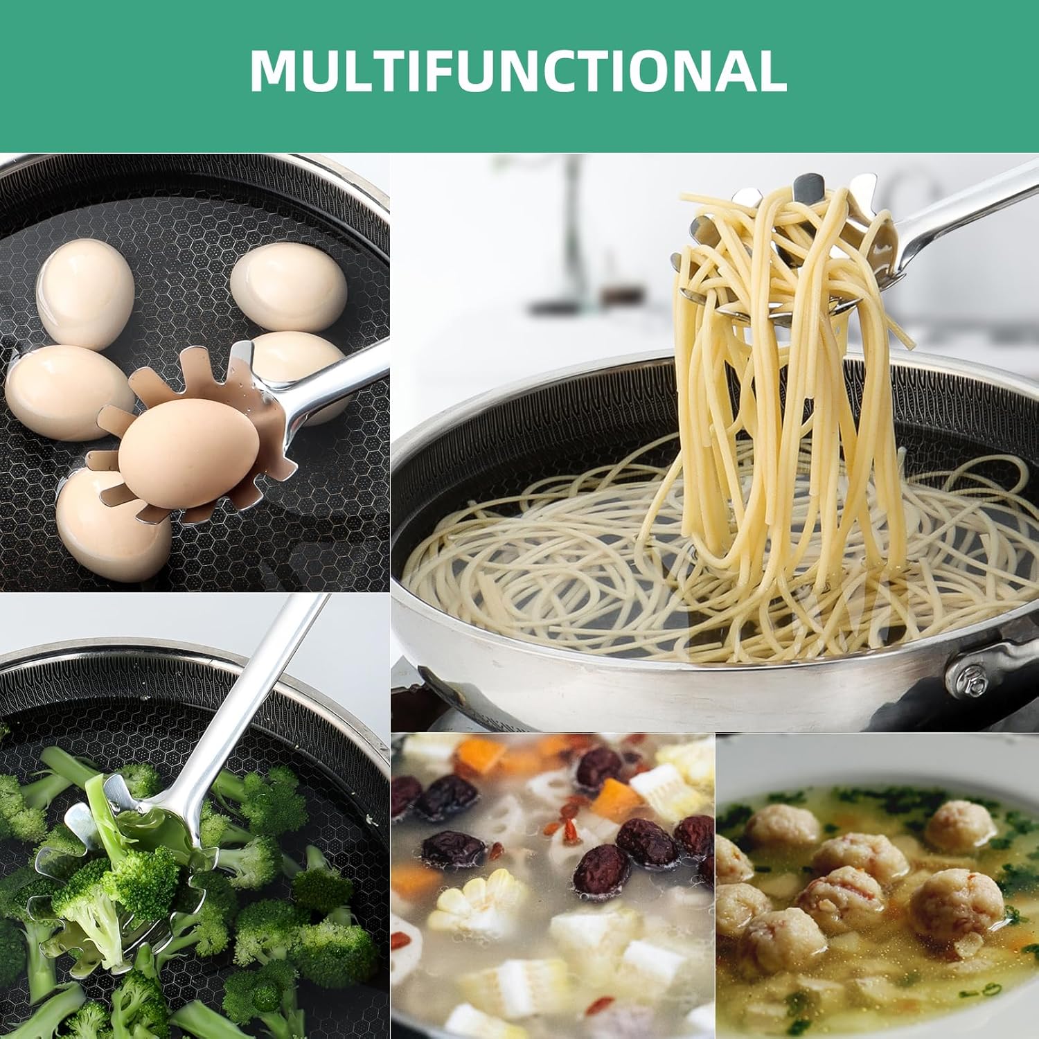 - 【Versatile Kitchen Tool】 The heat-resistant handle will prevent your hands from burning when you pick up the noodles. It’s convenient to use this pasta strainer spoon for serving spaghetti, fettuccine, ramen, fusilli, and tagliolini, or for taking boiled eggs or dumplings out of the pot