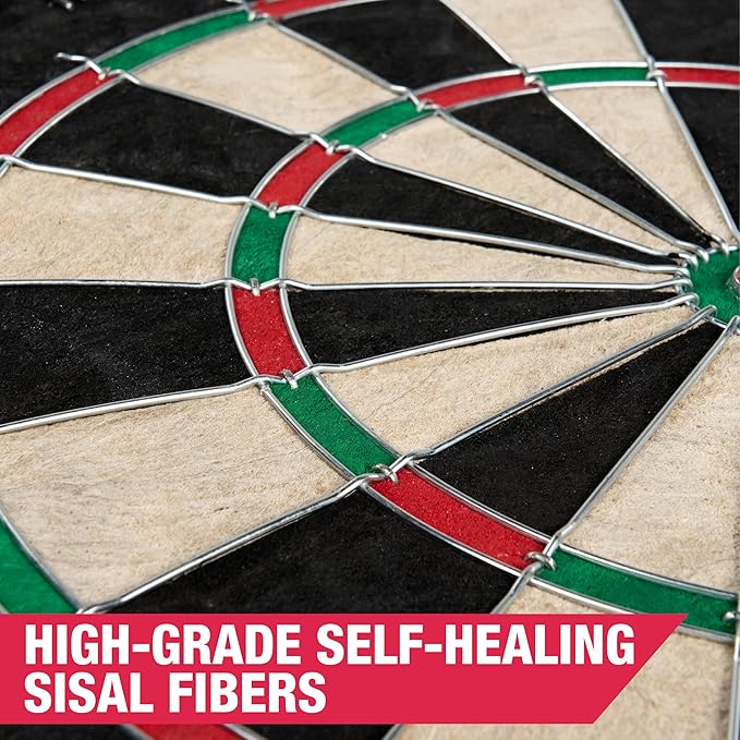 • STAPE-FREE BULLSEYE: To help reduce dart bounce-back this sisal dartboard has a thin 1.6 mm steel wire dividing the scoring targets and a staple-free bullseye found on high-end dartboards.