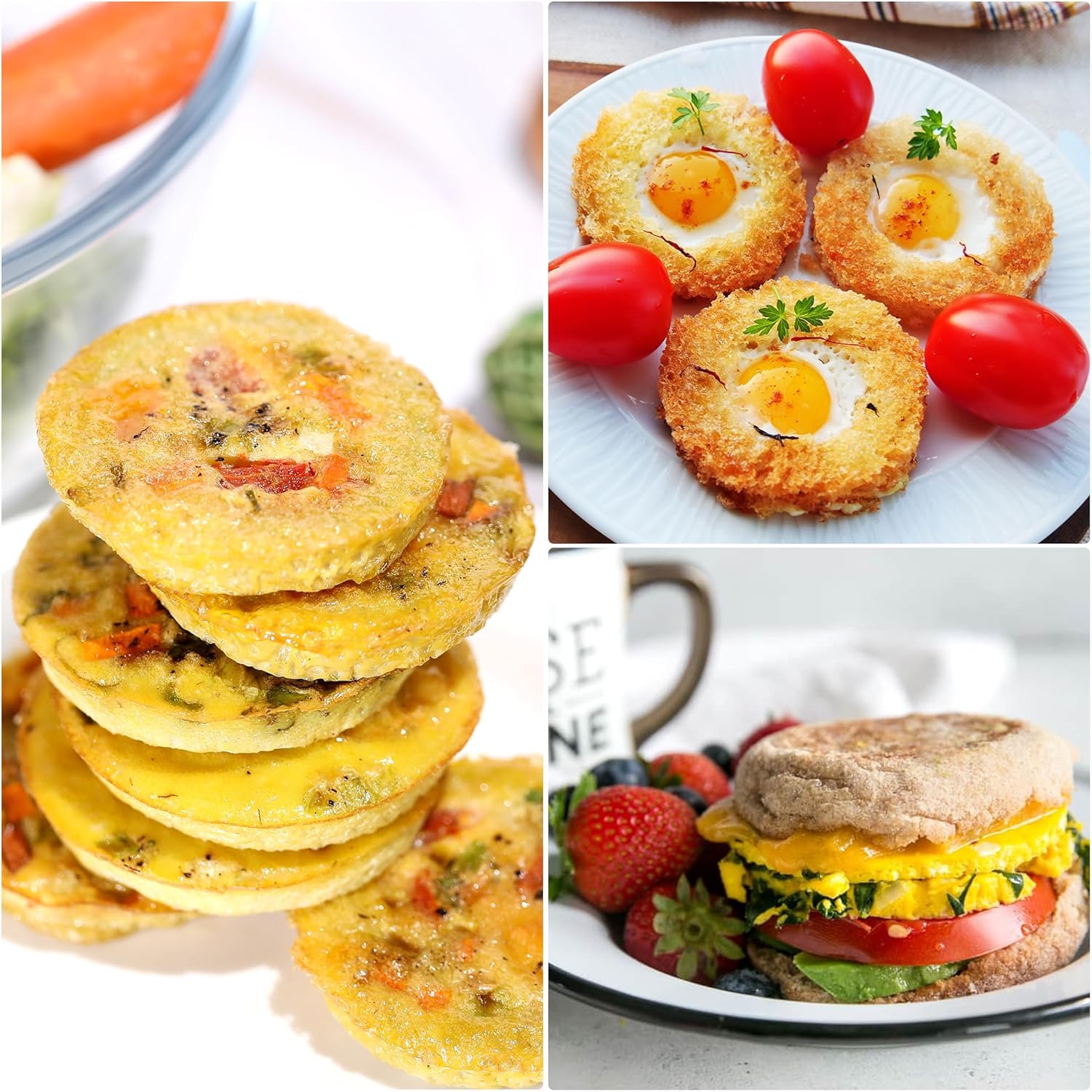 - Multi-funcation: This egg silicone mold is ideal for preparing English muffins, Egg Sandwich, Whoopie Pies, Corn Bread, Egg bites, Tarts, Sandwiches, Muffin tops, Cheesecakes, Hamburger bun, Egg bites, Cookies, Eggs and Fat bombs