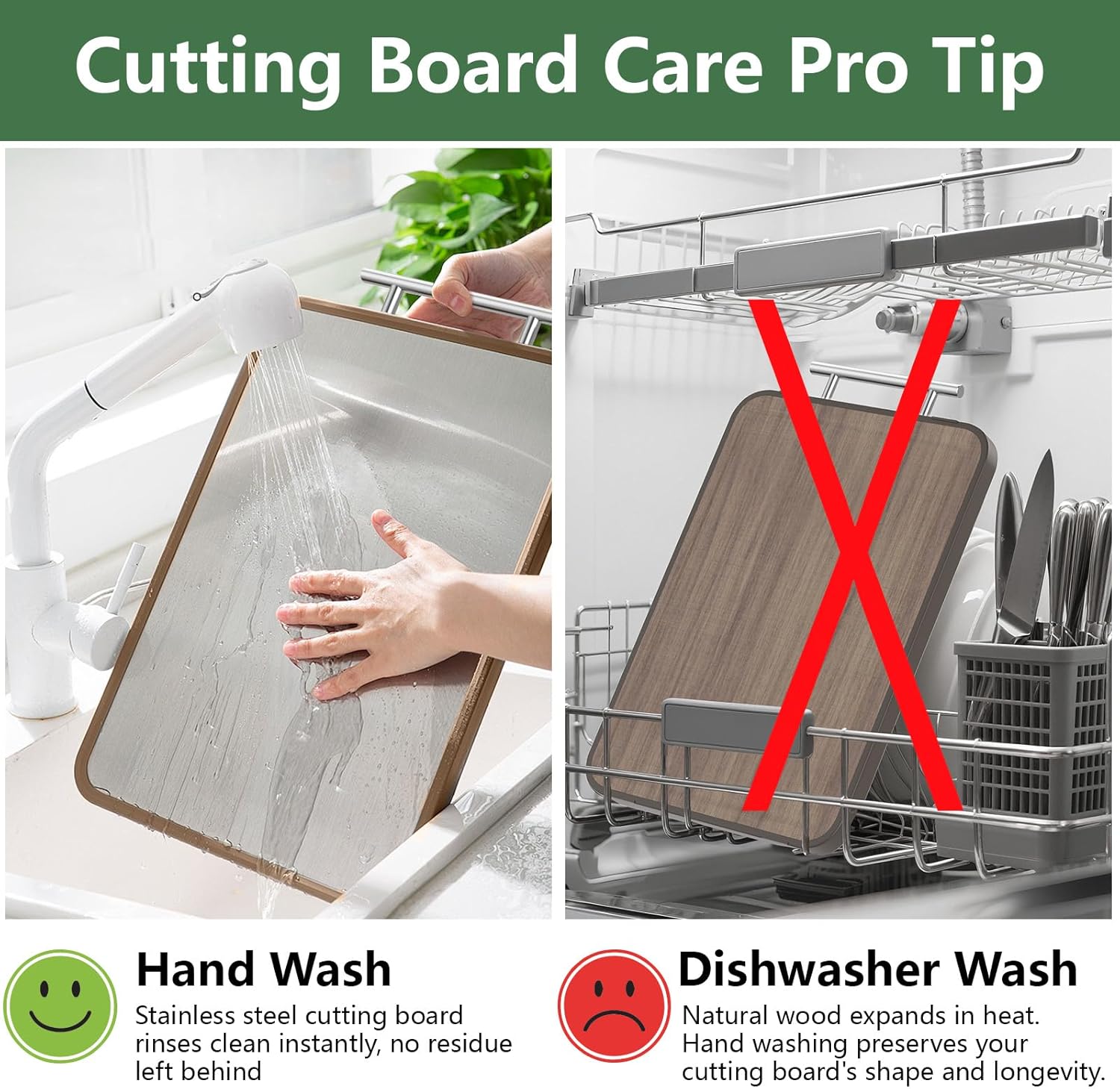 - Effortless Maintenance & Smart Features: Labeta cutting boards clean easily with just soap and water! The deep juice groove traps liquids and debris, keeping counters tidy. Sand-finished ebony resists knife marks, while the stainless steel hanging handle offers space-saving storage or portability for kitchens, RVs, or camping.