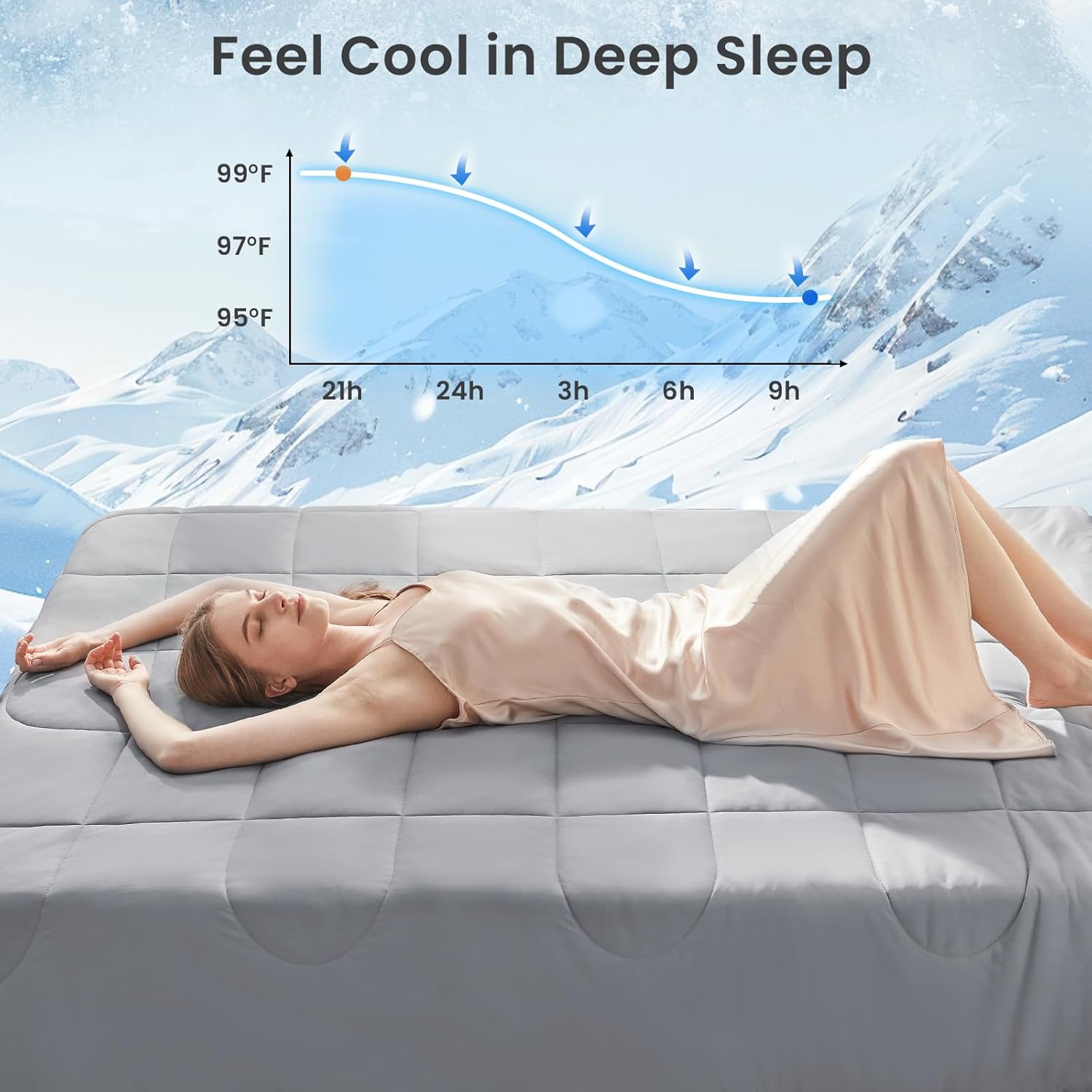 - Cooling blanket for hot sleepers - Designed with latest thermal regulation technology, this cooling blanket can quickly absorb body heat and immediately reduce the skin temperature by 2~5 degrees, ensures a consistently cool sleep environment, makeing you wake up refreshed, comfortable and dry — no sticky feeling. A real summer comforter for hot sleepers
