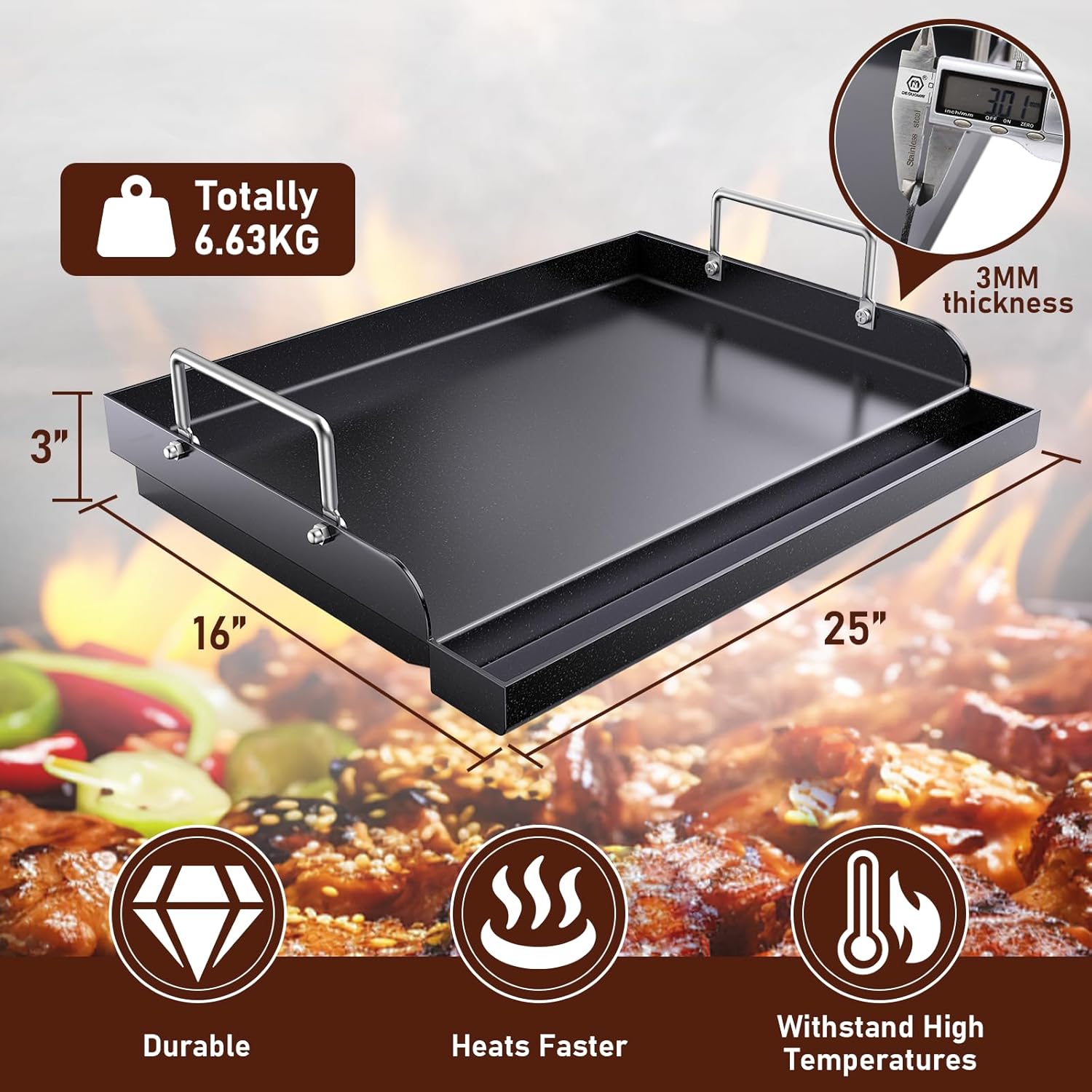 - 【Universal Compatibility 】Elevate your grilling game with the Uniflasy Universal Griddle, designed to fit most gas grills, charcoal grills. Spacious Dimension- 25 x 16 inches, this griddle is perfect for large meals, from sizzling steaks to pancakes and veggies. It's compatible with popular grill brands like Weber, Nexgrill, Charbroil, Kenmore, Camp Chef, and many more. Be sure to check your grill's dimensions before placing your order for a perfect fit