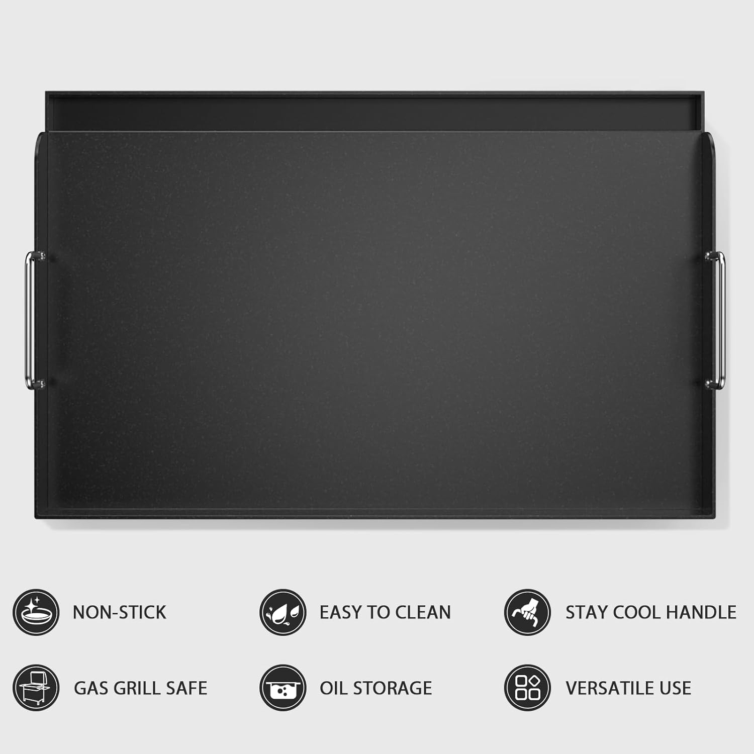 - Enhanced Features: 1. Upgraded Thickness: Prevents bending or warping during prolonged use. 2. Reinforced Support Ridges: Ensure stability and uniform heat distribution, eliminating hot spots and warping issues. 3. Detachable Handles: Convenient side handles make it easy to lift, carry, or store. 4. Built-In Grease Trough: Collects drippings to prevent flare-ups and makes cleanup effortless. 5. Polished Edges: Safe, smooth edges eliminate the risk of scratches during use.