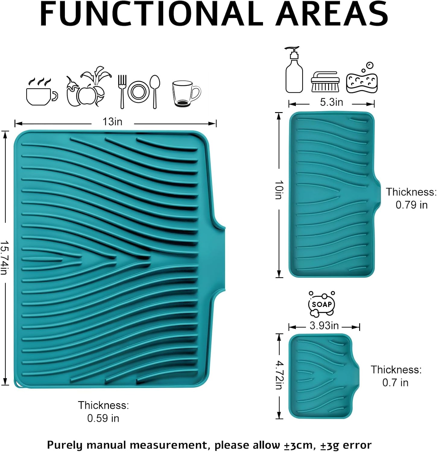 Silicone Dish Drying Mat for Kitchen Counter, Dish Drying Pad, Non-Slip Drain Pad with Built-in Drain, Heat Resistant Stone Drying Mat, 3 pcs (Green)