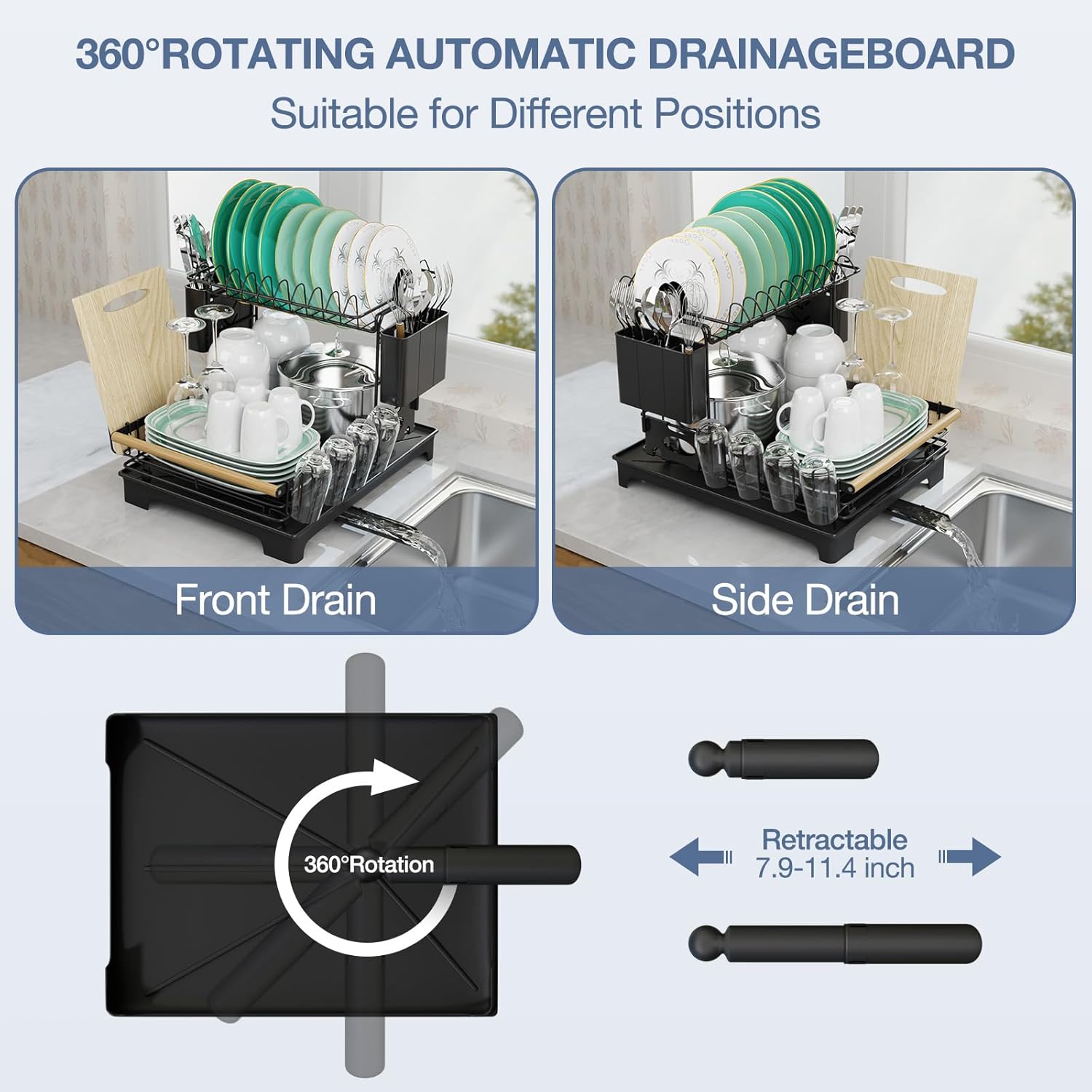 - Efficient Drainage System: This dish drying rack with drainboard is designed with a removable drainboard which includes central drainage holes and a drainage channel, making sure the water flows directly into the sink and not the countertop. The retractable drainpipe can be rotated 360Β° which is easy to adjust the placement of the dish drainers for kitchen countertop more freely according to the position of the sink. Perfect for avoiding leaks and draining water efficiently. (Note: Make sure your kitchen sink is flush with the counter for better fitting the height of drainboard.)