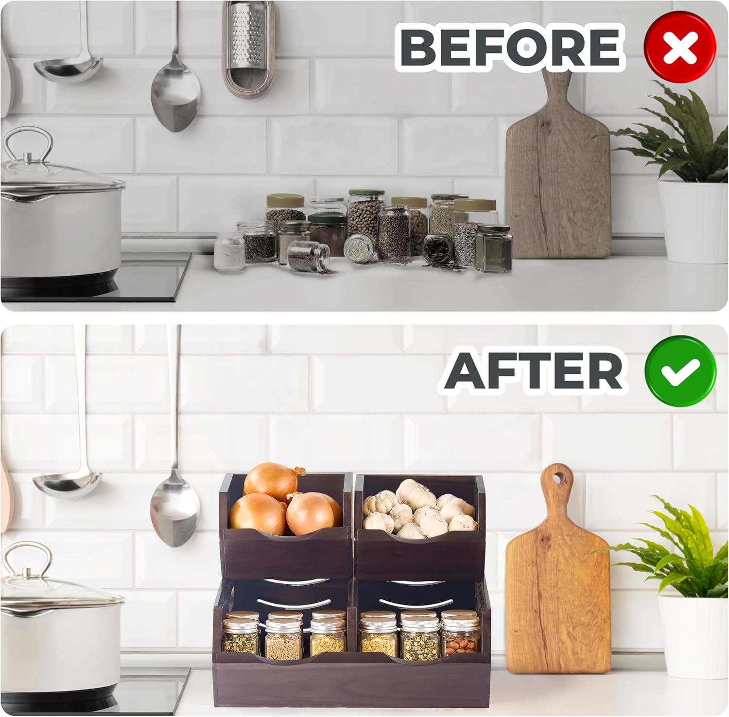 Acacia Wood Pantry Storage Bins - Stackable Open Front Kitchen Baskets with Airflow Vent for Potato, Onion, Fruit, Vegetable, and Bread Storage, Wood Organizer for Pantry and Countertop