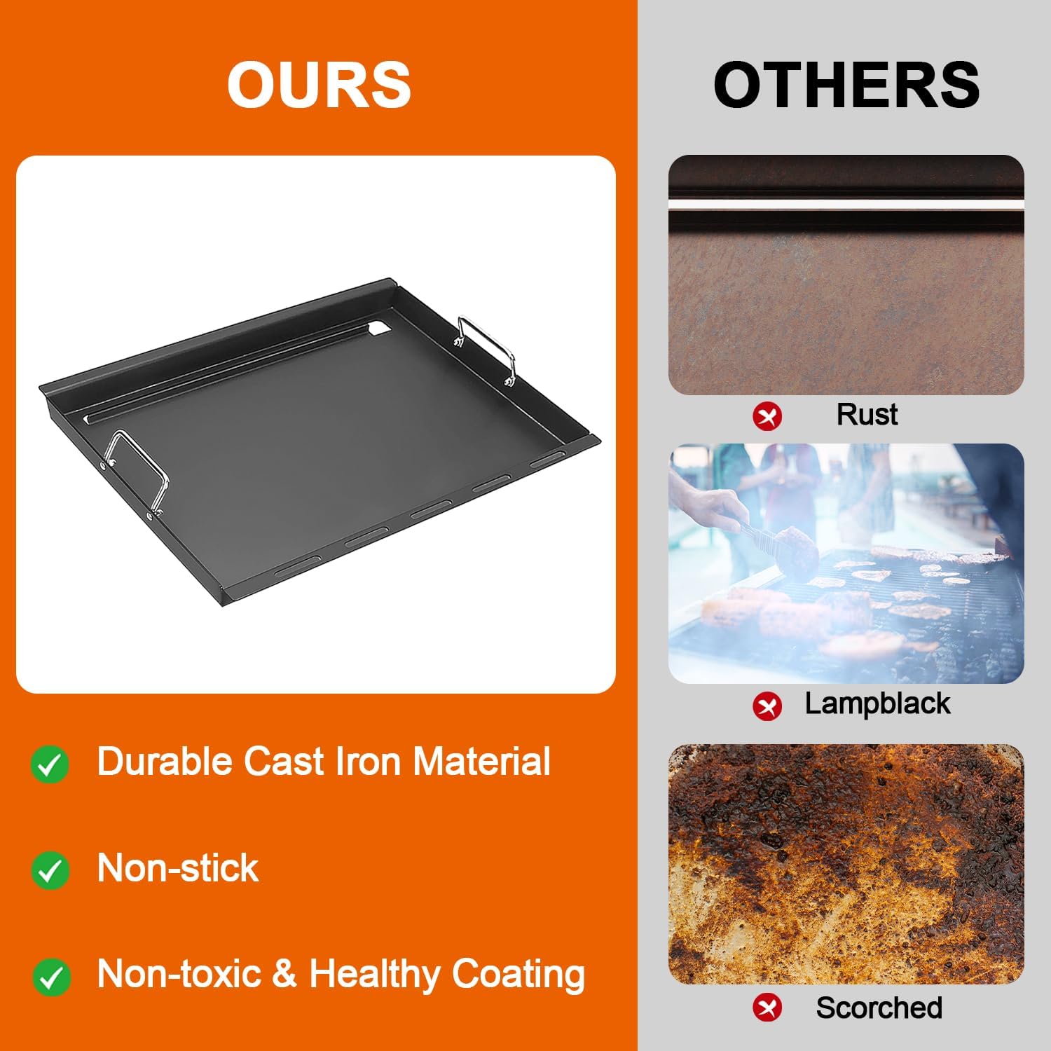 - 【Excellent Features】Detachable Handles for easy to lift, carry, or store; Grease Trough for preventing flare-ups and making cleanup effortless; High Side Walls for flipping and turning food without splashing grease stains; Thick and heat-resistant silicone gloves for protecting your hands from scald.