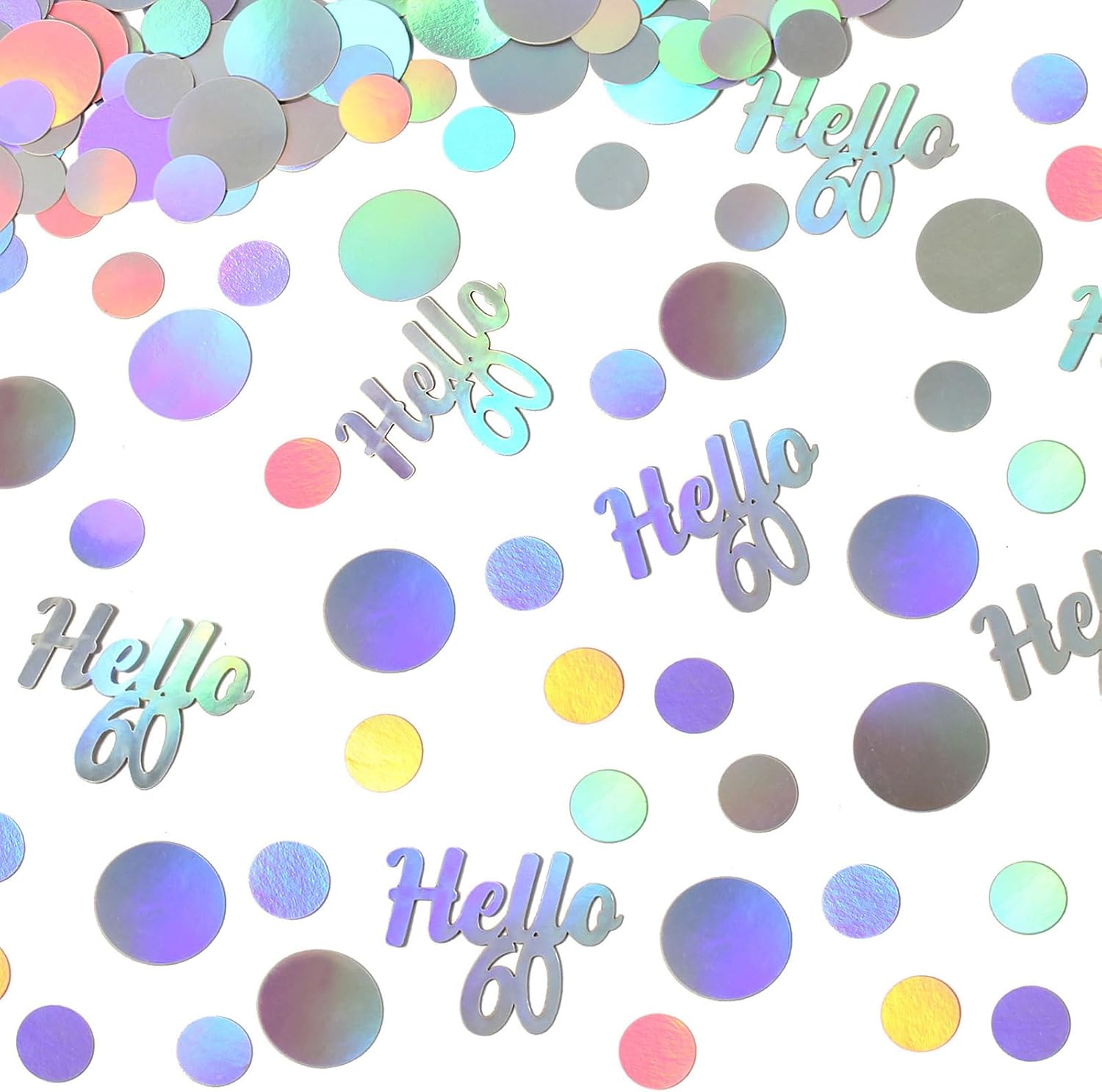- Premium material, proper size and charming color.The cute biodegradable paper confetti is made from double sided silver foil paper card and well cut,the color is super amazing,looks like silver,but also like lots of pastel colors changing under the light. There is two sizes circles mix(1inch and 0.6inch),”Hello 60” letter confetti(1.7*1.4inch) ,recommend as table decorations or diy craft supply.