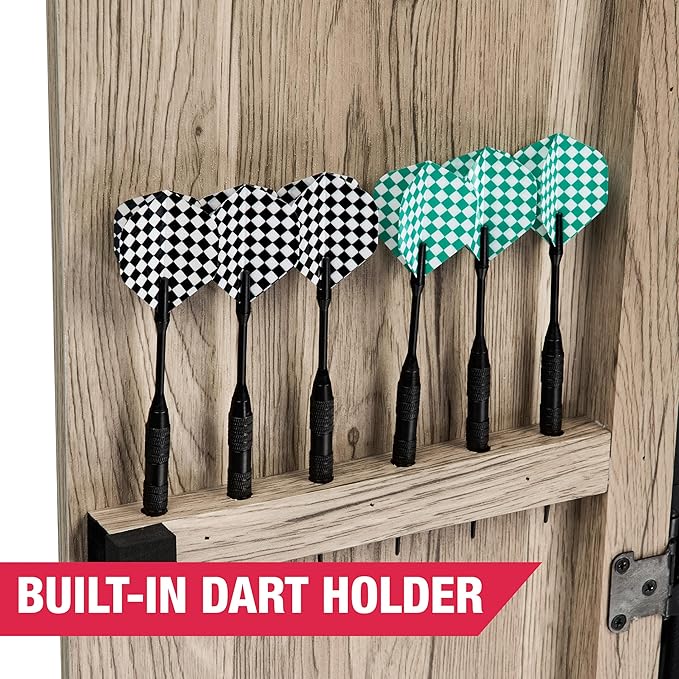 • STORAGE & MOUNTING: Built-in dart holsters store up to 12 darts, includes mounting hardware for most indoor walls, 4 extra mounting holes in the catch ring provide added security, and the open cabinet provides 38.75โ€ x 24โ€ of wall protection.