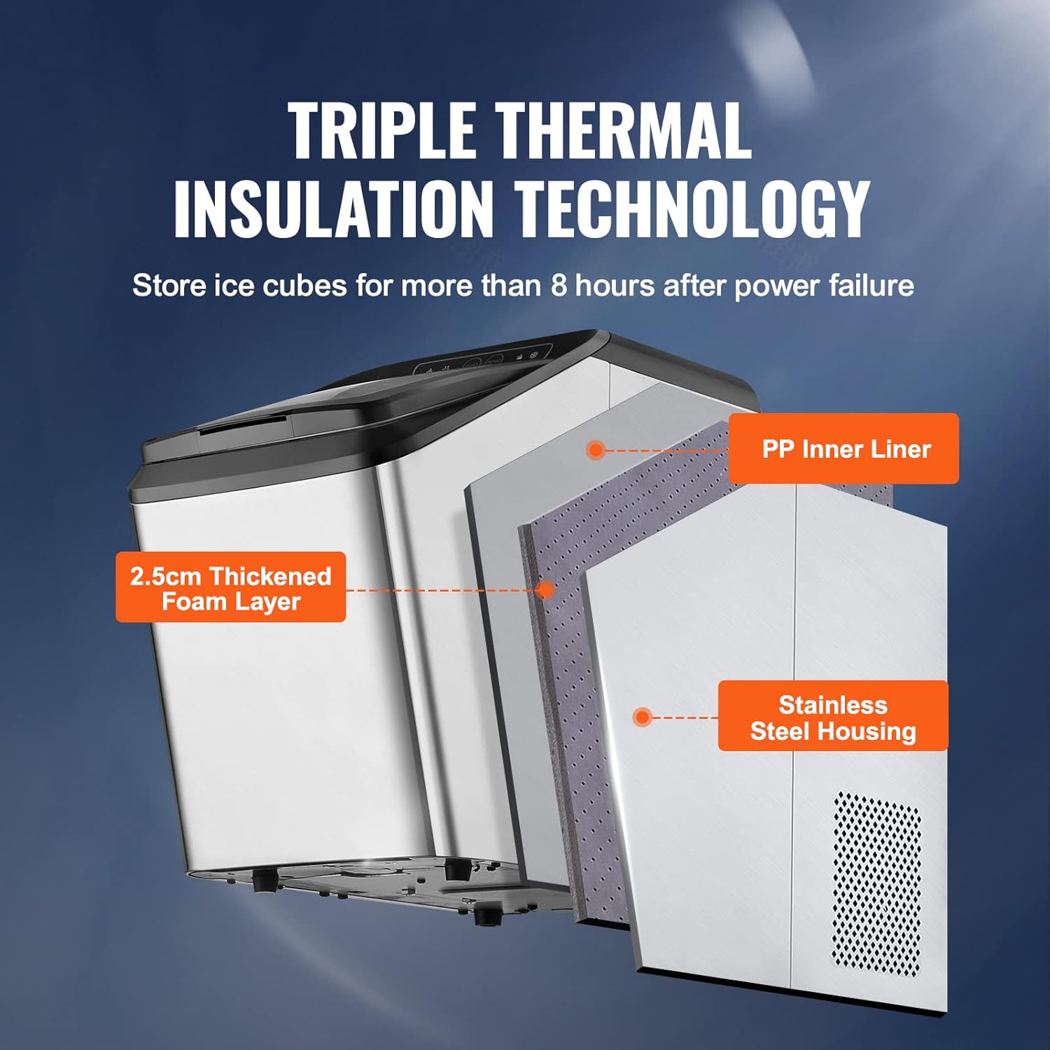 - Keep the Cold in: The portable ice maker has a 2.5mm foam layer, stainless steel shell and three layers of insulation material, allowing it to keep ice for over 8 hours in case of power failure.