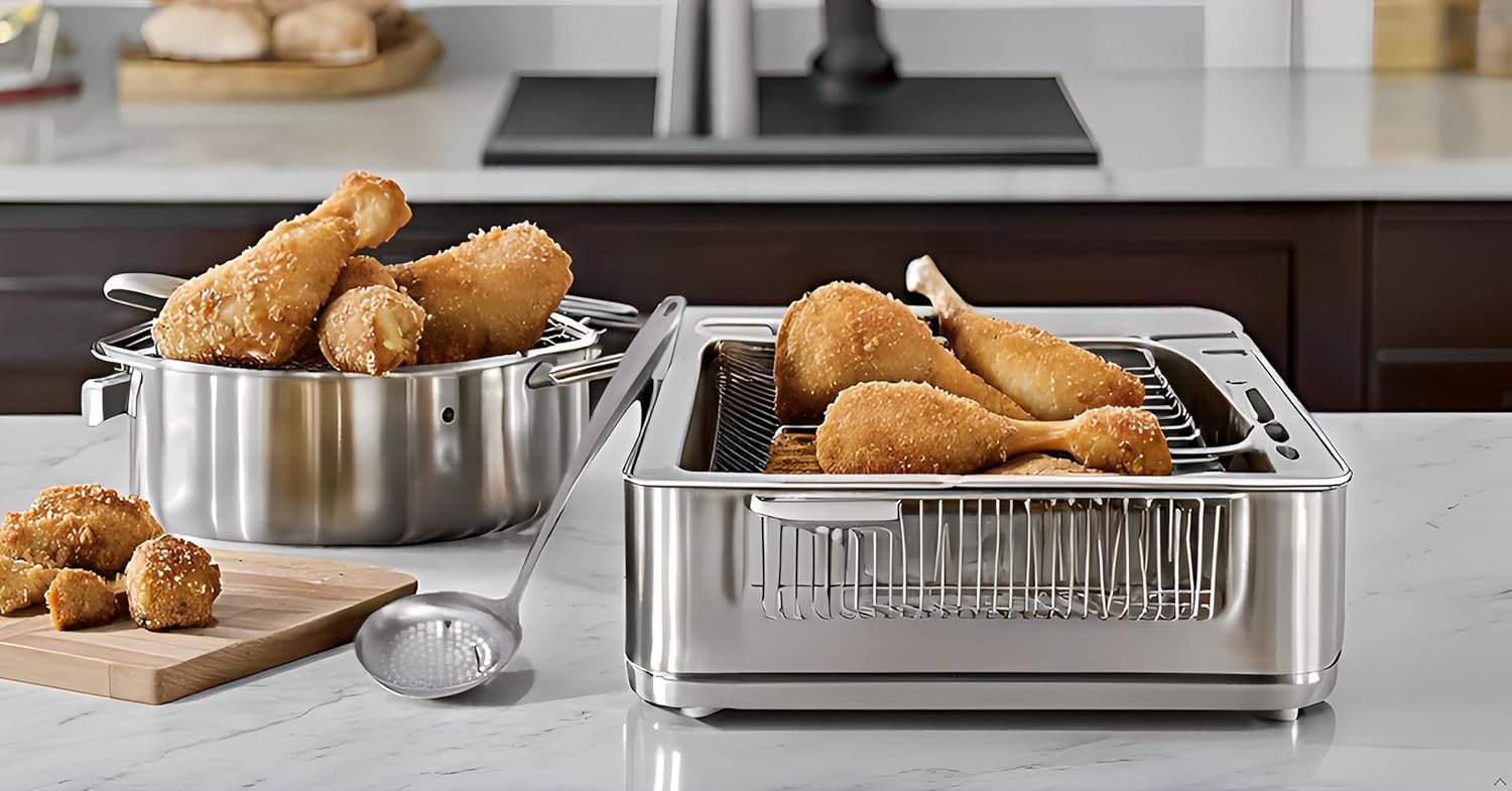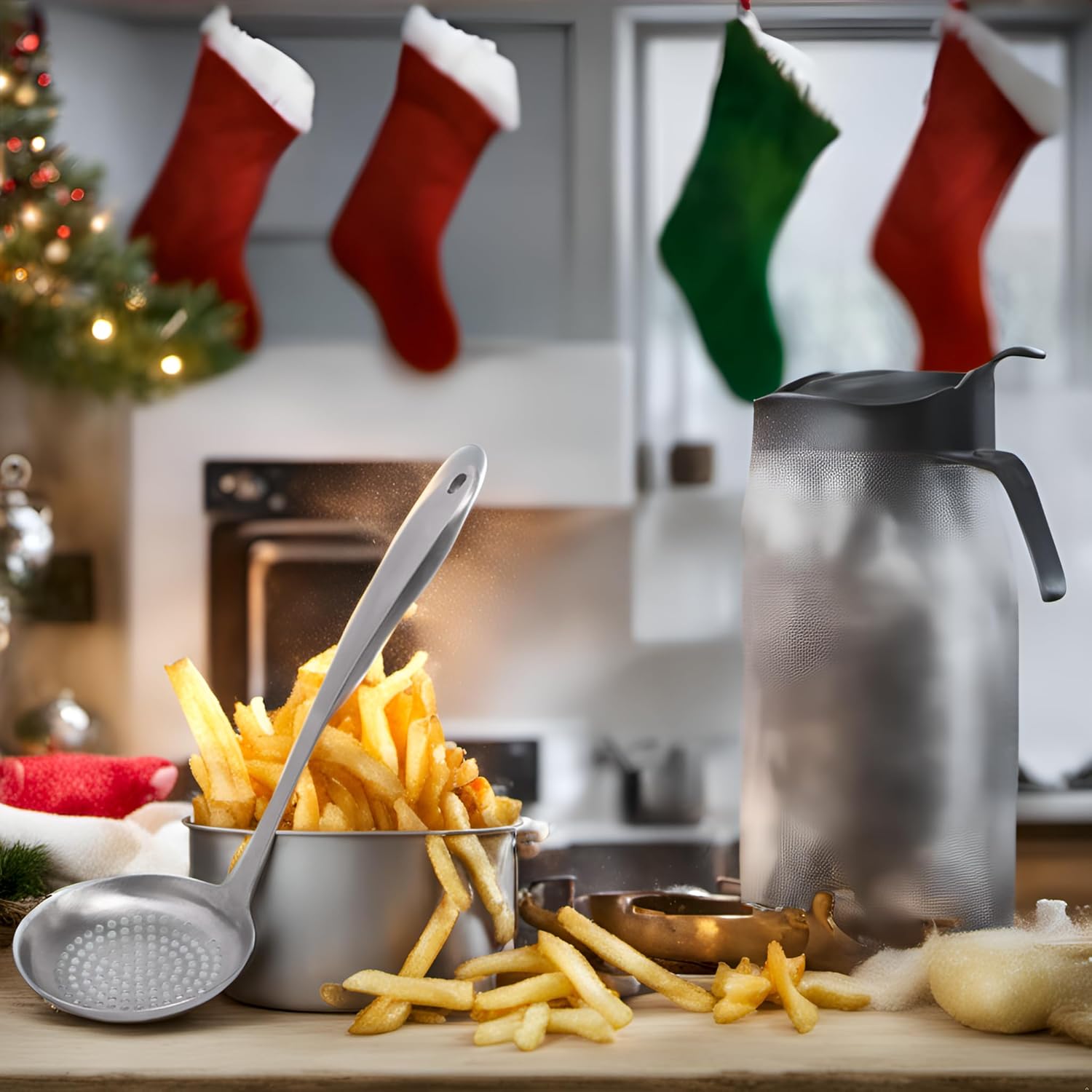 - PERFECT FOR DEEP FRYING AND COOKING - This skimmer slotted spoon is crafted of 18/8 304 stainless steel and ergonomically shaped for excellent balance and control - for a difference you can really feel in the hand. It's perfect for frying foods, like potato chips, French fries, fried chicken, and scooping up poached eggs, vegetables, noodles, pasta, wonton and more.