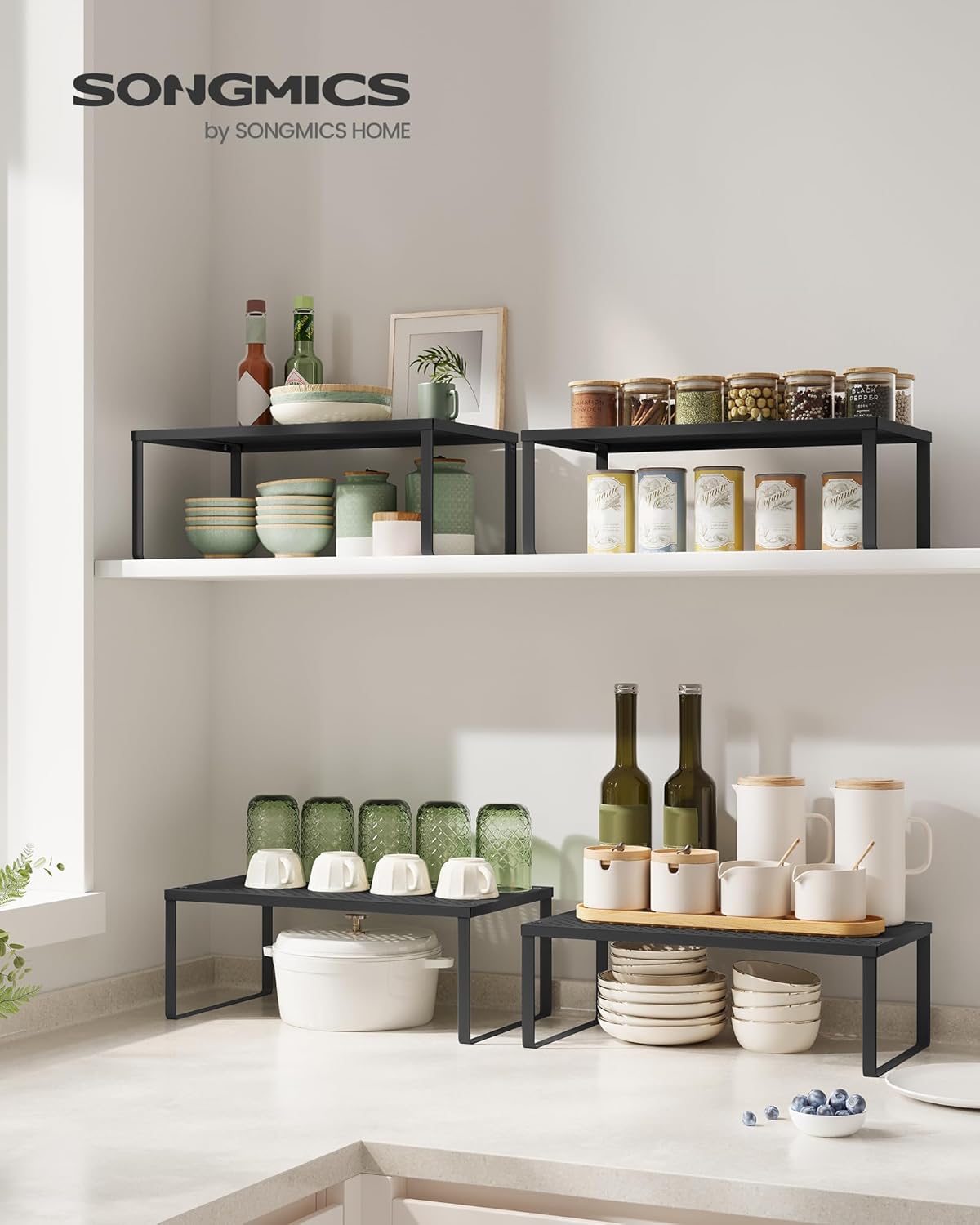 SONGMICS Spice Racks, Set of 2 Metal Cabinet Shelf Organizers, Countertop Organizers, Shelf Risers, Stackable, Expandable, Ink Black UKCS401B01