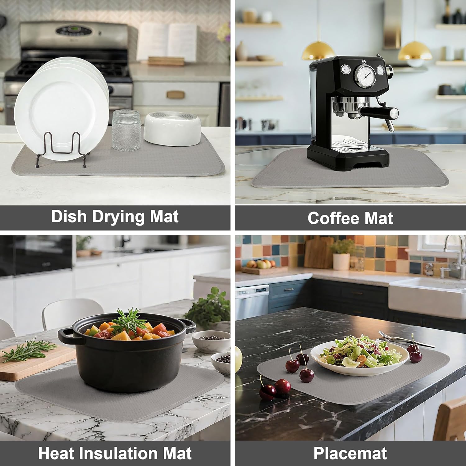 - Highly Absorbent Drying Mat for Kitchen Counter: Made of premium microfiber, each drying mat in this set absorbs up to 4x its weight in water. Ideal as a dish drainer mat or dish drying pad, it protects your kitchen counter from water spots and moisture, making cleanup faster and easier