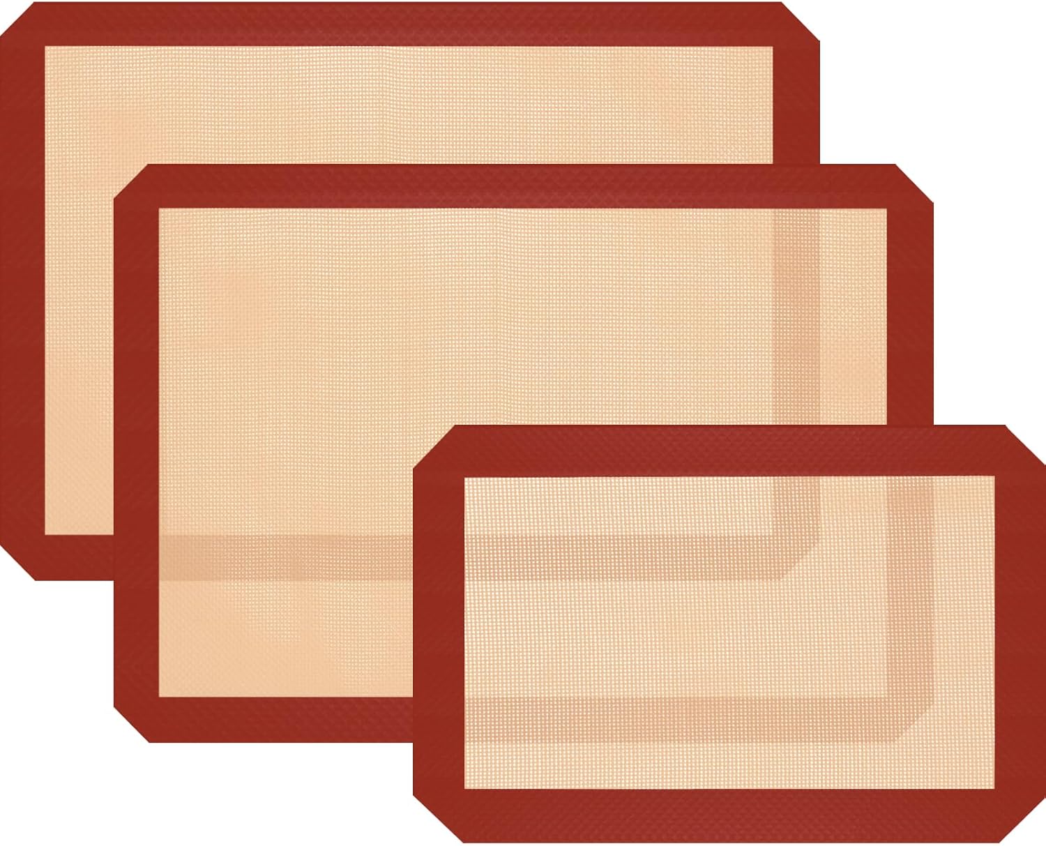 - [ MULTI-PURPOSE BAKING SET ] Silicone mat for baking set includes 2 half sheet baking mats (16.53 x 11.61in) and 1 quarter baking mat (11.81 x 7.87in). Silicone baking mats are great for macarons, pastries, cookies, breads, vegetables and meats. Make them a good helper for your cooking.