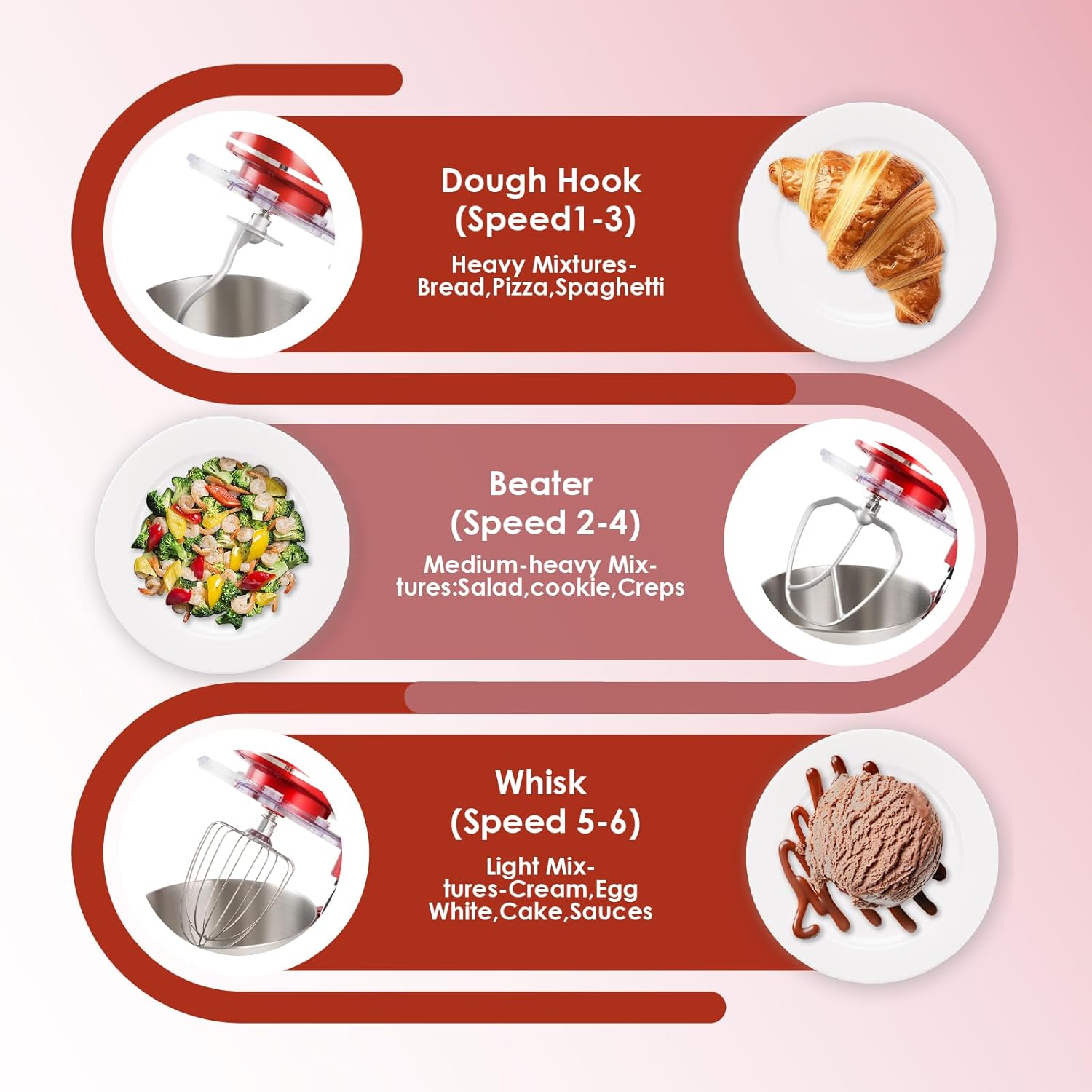 - 3 in 1 Electric Stand Mixer - Multi-functional solution for all mixing needs like cakes, bread, biscuits, pastries, muffins, waffles and etc. Dough hook for bread/pizza dough, whisk for fluffy egg whites/cream, beater for mixing cookie dough or salad evenly in minutes.