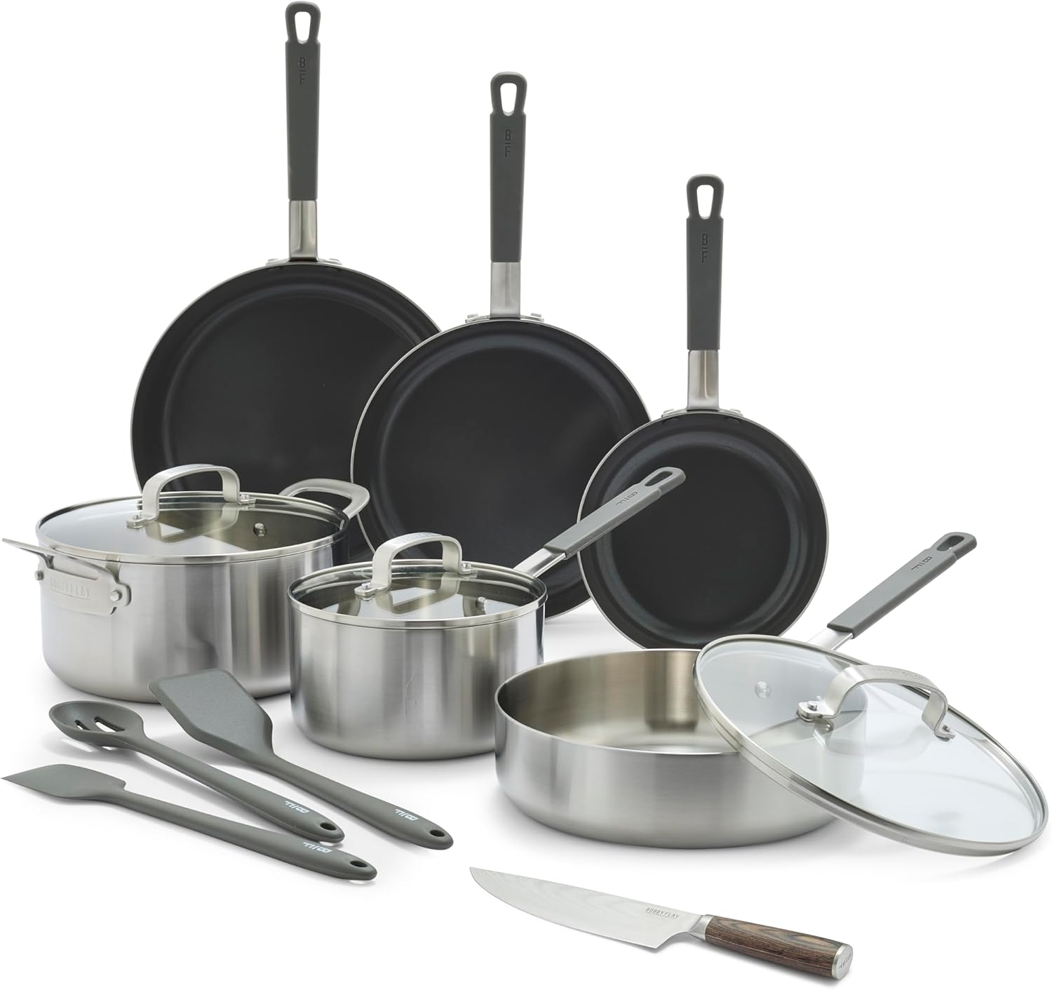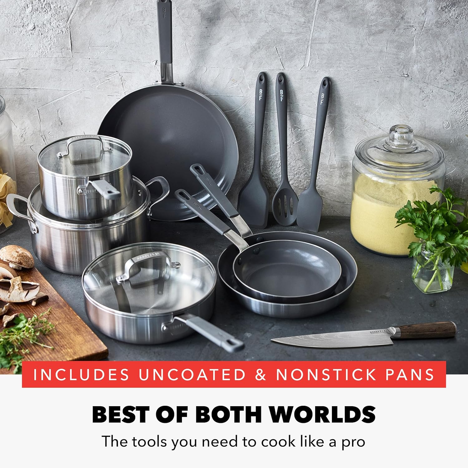 GreenPan x Bobby Flay Stainless Steel 12 Piece Cookware Pots and Pans Set and 8" Chef's Knife, Professional Grade Tri Ply, PFAS-Free Ceramic Nonstick, Induction Suitable, Dishwasher & Oven Safe