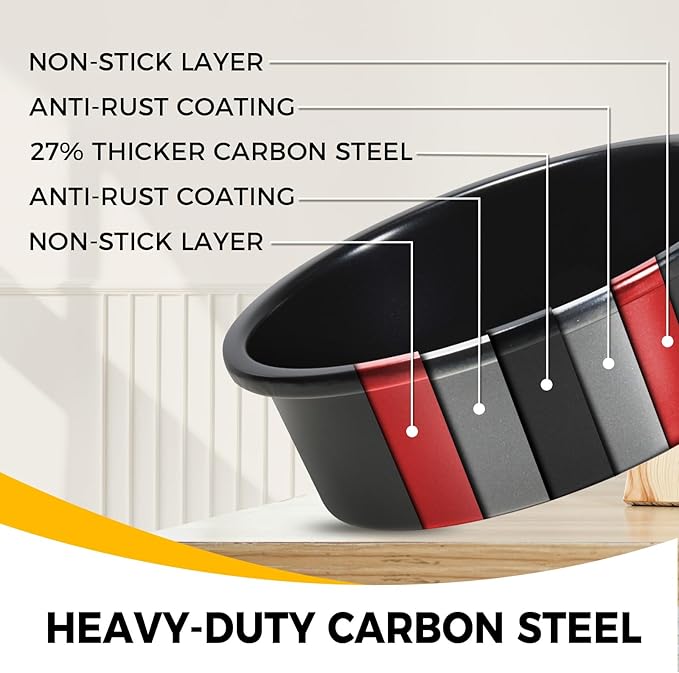 - PREMIUM THICKENED MATERIAL - With 27% thicker carbon steel, this durable 8inch cake baking pans set is constructed from heavy-gauge carbon steel for stability, even heat distribution, and durability for years to come. Warranty against peeling off with heat-resistance temperature: 450β