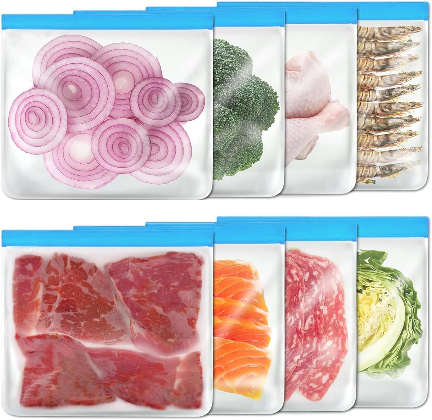 - DOUBLE SEALED LEAKPROOF: These reusable freezer bags will give you absolute confidence to hold liquids or sauces. Because they are 100% leakproof. The double-seal design keeps liquids and air locked inside. At the same time, the airtight function of reusable food bags will keep food fresh longer. Everyone can easily open and close the bag.