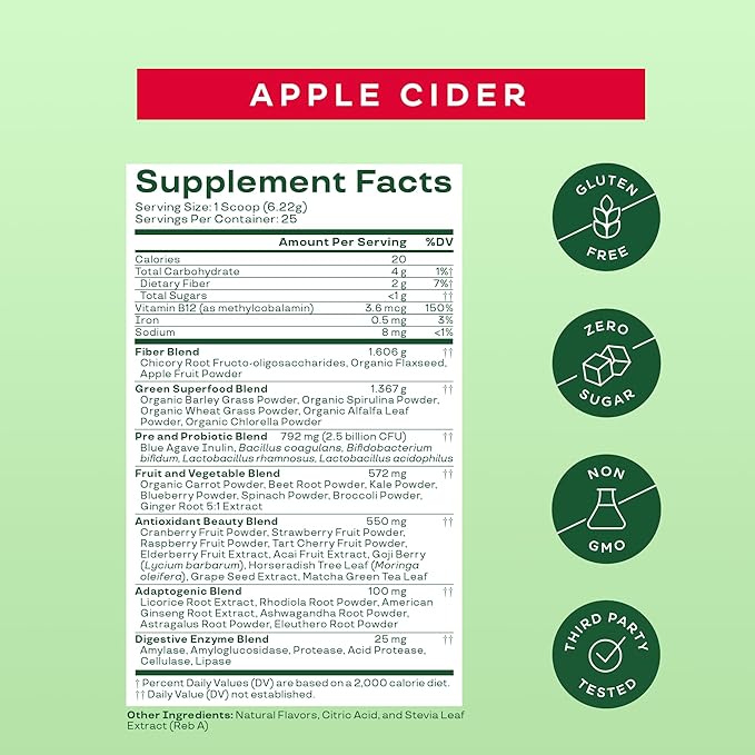• DELICIOUS APPLE CIDER FLAVOR: Here at Bloom Nutrition, we love flavor. That’s why we think your favorite supplements should be made with high-quality ingredients that support your health and taste delicious. Our apple cider flavored Super Greens delivers a taste of cozy winter months!