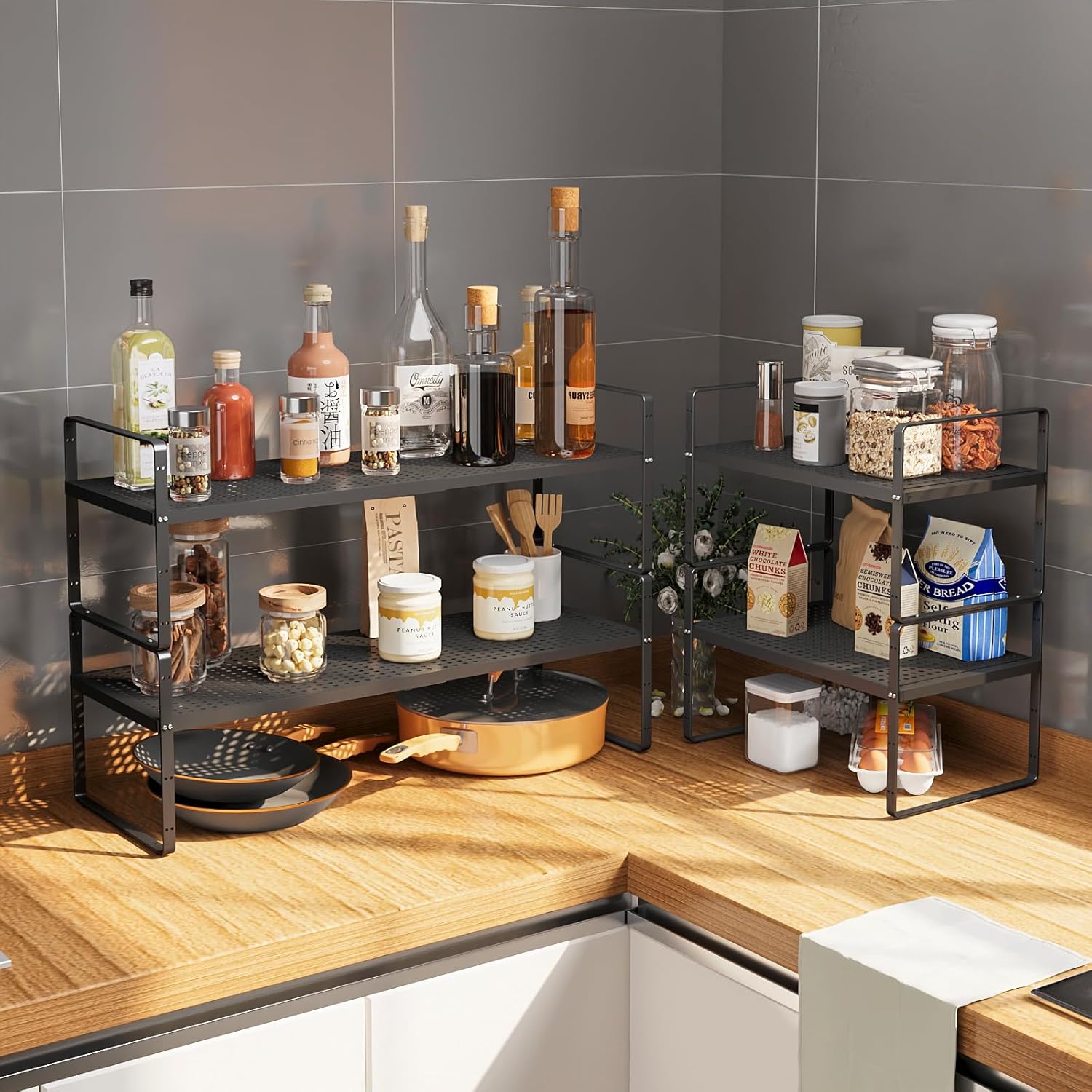 - Expandable and Stackable Shelves:Cabinet organizers choose 4 heights according to the space requirements, kitchen cabinet organizer length from 16.5"-27" free and thorough change, enjoy the fun of storage. Spice rack stacking design, greater increase your storage space.