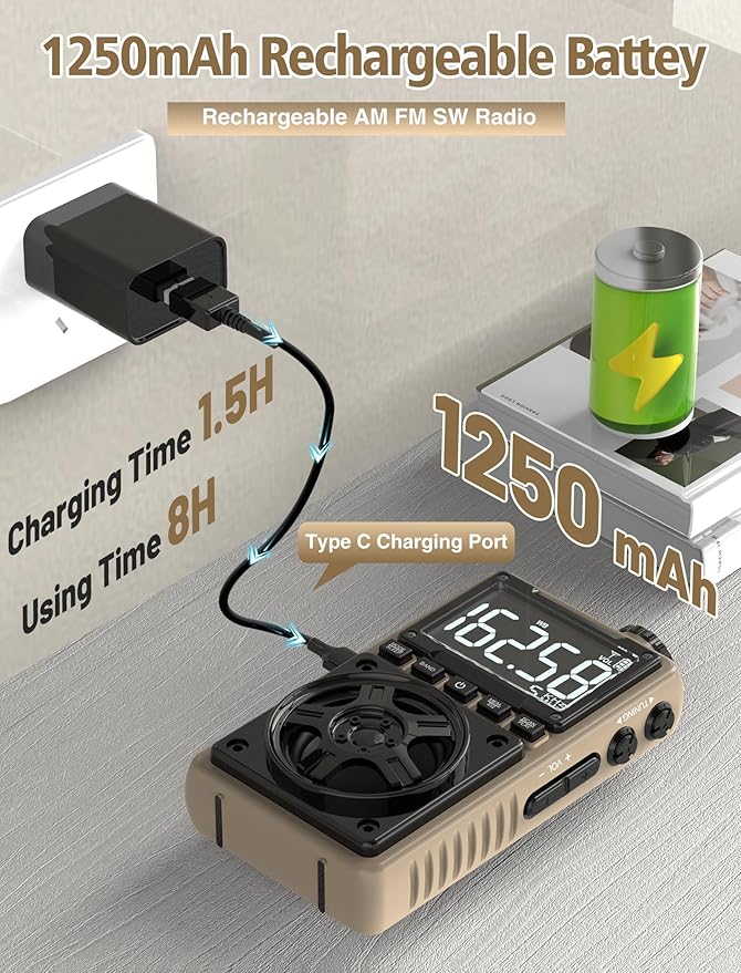 • 【1250 Rechargeable Battery&Flashlight】The rechargable shortwave radio comes with a durable built-in 1250mAh rechargeable battery,you can enjoy up to 10-12 hours of music and news on a single charge(using type-c), without the hassle of replacing batteries. Whether you're at the beach, camping, or just enjoying a picnic in the park, you can take this walkman radio with you.The rechargable AM FM radio also comes with a flashlight that allows you to illuminate the environment in case of an emergency.