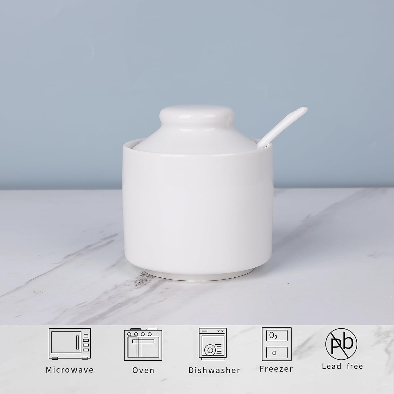 - DESIGN CONCEPT: This sugar bowl is equipped with a lid and a small spoon. The lid can keep your ingredients away from dust. There is a perfect notch on the lid for placing the spoon, so you don’t have to worry about placing the spoon randomly