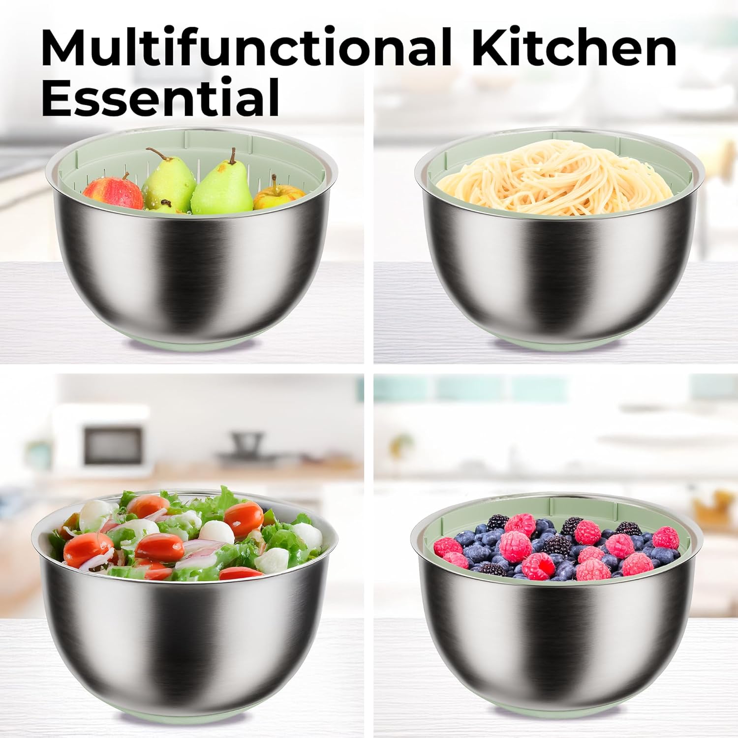 - MULTI-PURPOSE DESIGN - The stainless steel salad spinner inner basket doubles as a colander, and the steel bowl because its large capacity can be used for cooking other foods, as mixing bowl or serving bowl.