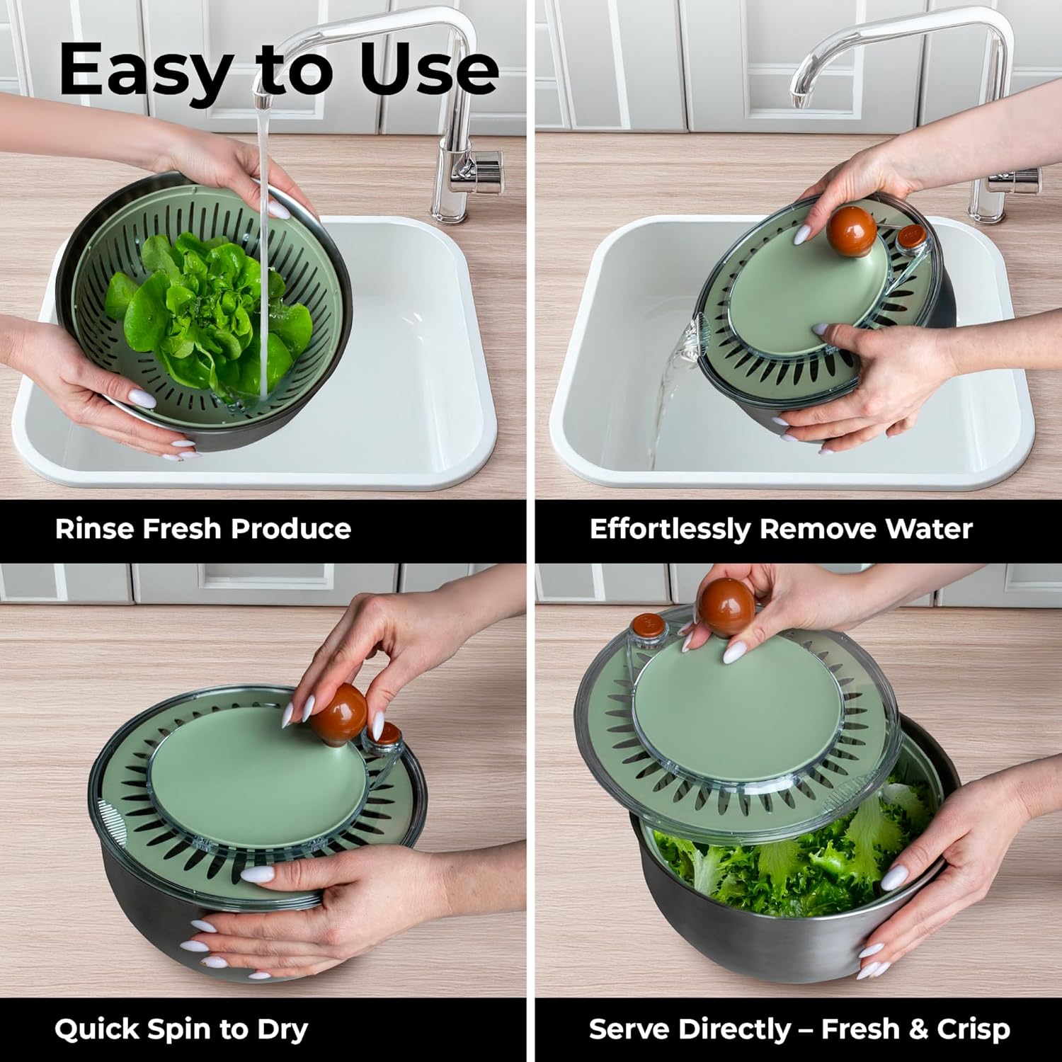 - NON-SLIP STABILITY - The silicone base holds the large salad spinner/ fruit cleaner spinner firmly in place, preventing movement or slippage during high-speed spins, even on smooth or wet surfaces. It also protects countertops from scratches, keeping your kitchen surfaces in top condition.