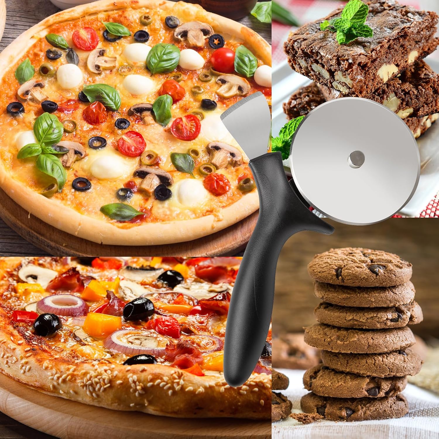 - 【Widely Use】The large and non-slip handle of this pizza cutter is comfortable to hold and fits all hand sizes. It is perfect for cutting all types of dough, pizza, waffles, brownies, pies, herbs, quesadillas, chopped salads, vegetables, meat, cheese and pasta- no matter what type of pan it’s in. It’s especially helpful for use in pans with high sides or rims.