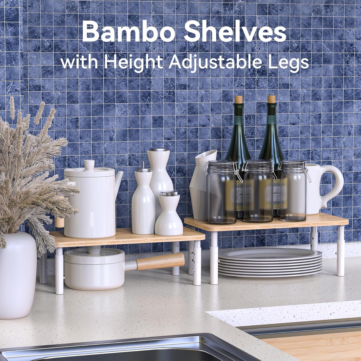 Cabinet Organizer Shelf, Spice Rack Set of 2 Kitchen Pantry Cupboard Shelves, Stackable, Height Adjustable, Natural Bamboo (15.6" Wx77.Dx6.57 H per Pack)