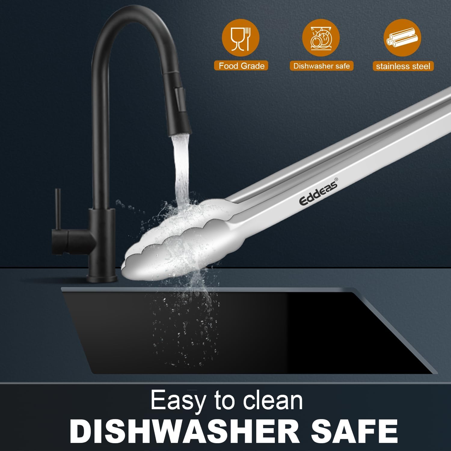 - FOOD GRADE STAINLESS STEEL - Eddeas kitchen tongs are made food-grade all stainless steel in one piece for enhanced robustness and heat resistance, rust resistance and easy handling. Tongs for cooking the overall light weight and ergonomic features are maintained.
