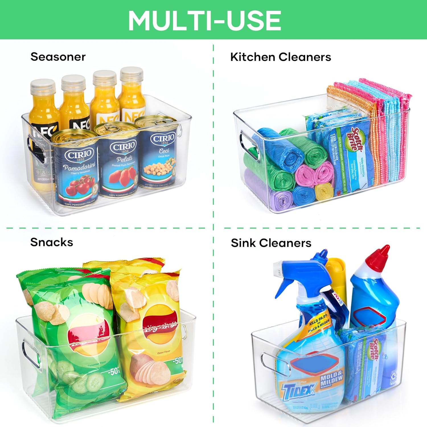 - Versatile: This organizing bins accommodates various items easily, whether it is snacks, vegetables, fruits, drinks, cans or sanitary ware, clothing, tools and more.