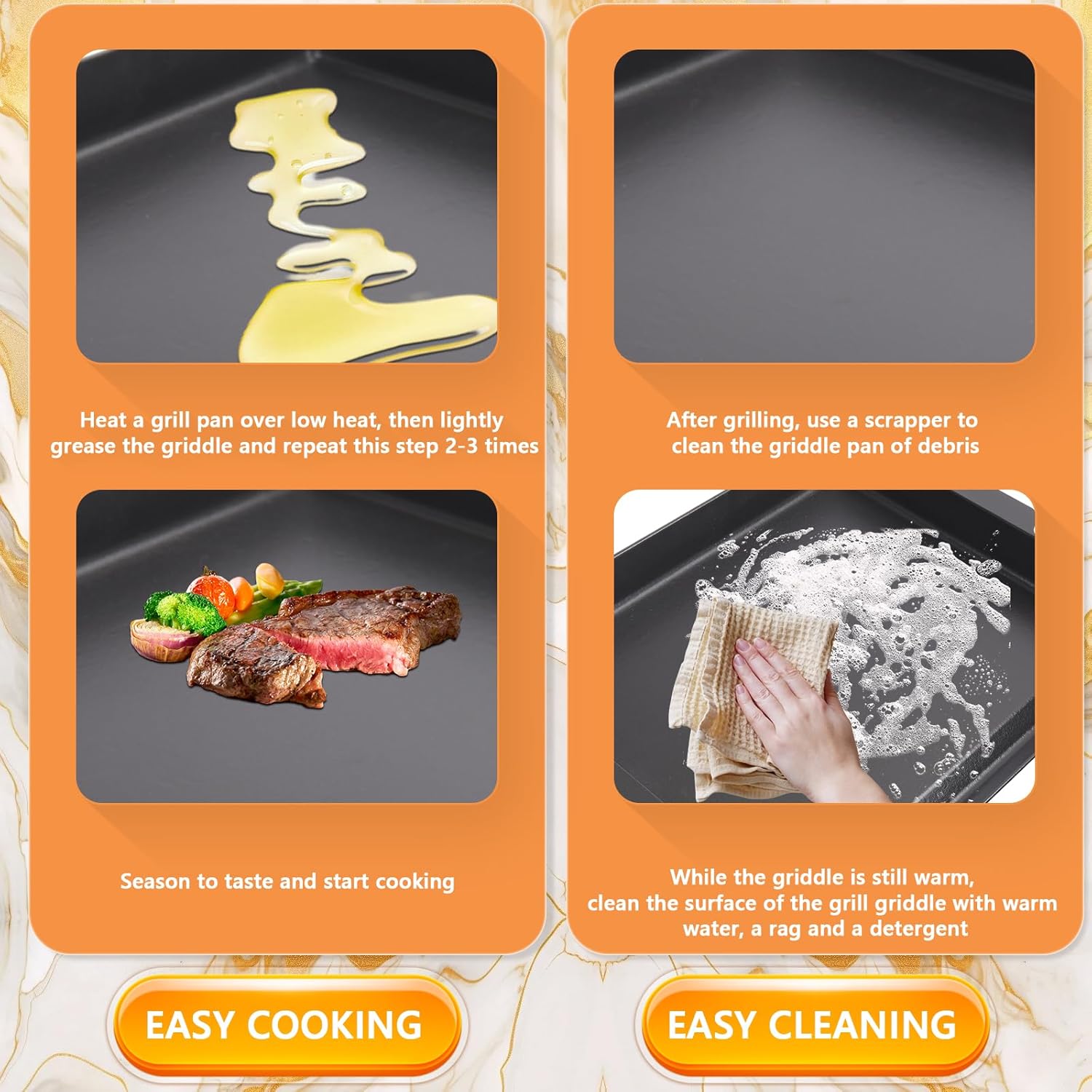 - Premium Quality: This cooking griddle crafted from durable cast iron, special sturdy construction and evenly heated. Before using the flat top grill griddle, you can season it first. Convenient for your use. When used correctly this camping stove griddle heats food evenly and cooks delicious meals. Note: When seasoned with cooking oil before use, cast iron creates a natural non-stick surface that makes cleaning a breeze and extends its life.