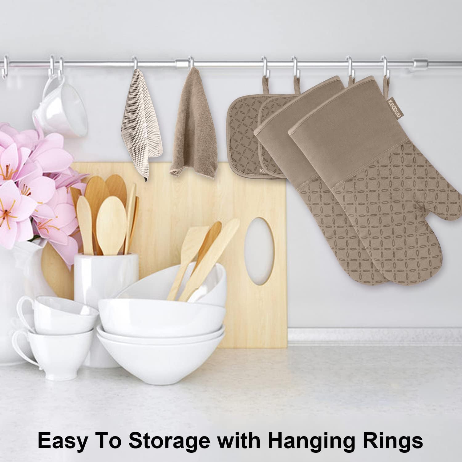 KEGOUU Oven Mitts and Pot Holders 6pcs Set, Kitchen Oven Glove High Heat Resistant 500 Degree Extra Long Oven Mitts and Potholder with Non-Slip Silicone Surface for Cooking (Khaki)