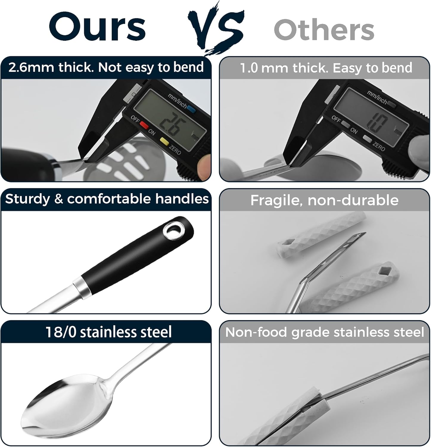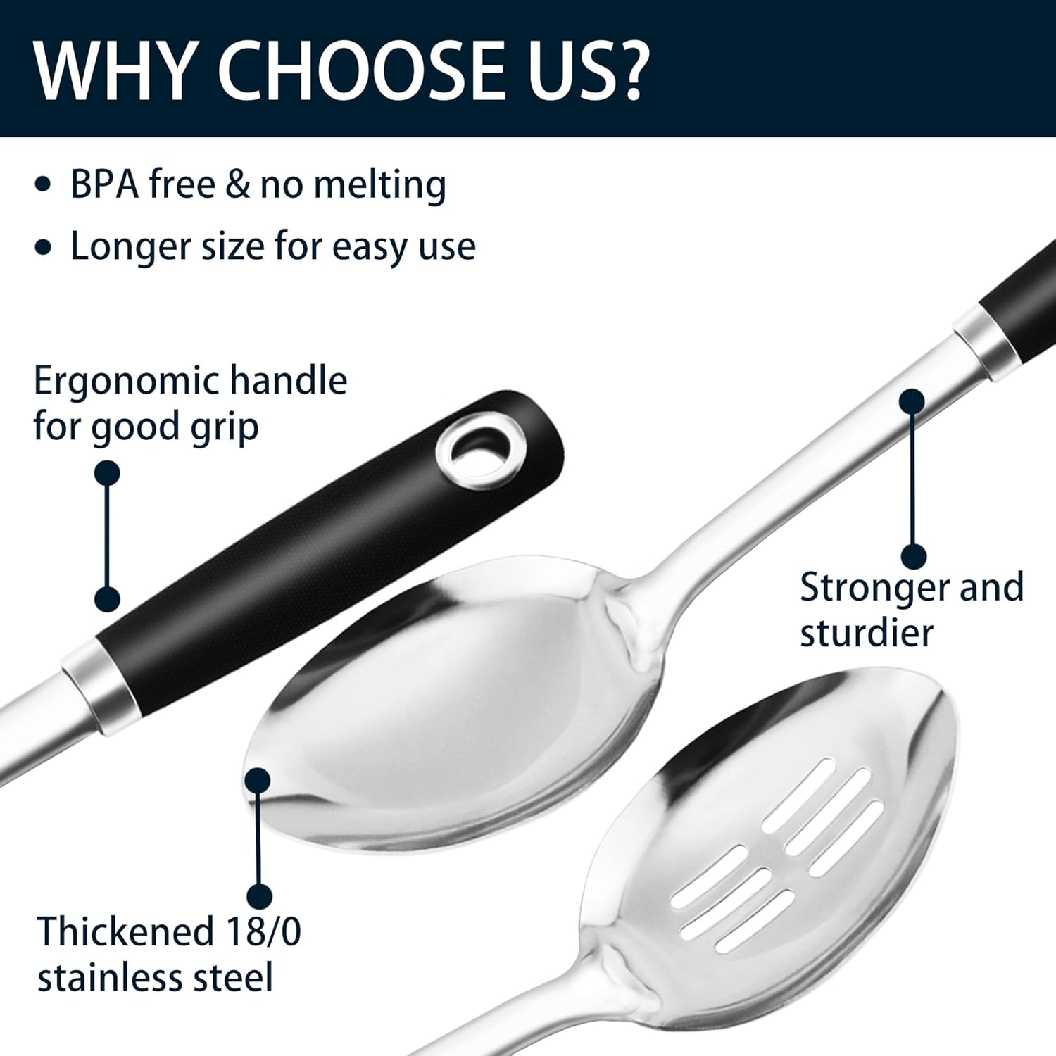 - WHY 18/0 STAINLESS STEEL - Won't melt or break like silicone cooking utensil and won't mold like wooden utensil, a healthier choice that keeps you away from silicone PFAS PFOA PTFE etc,.!