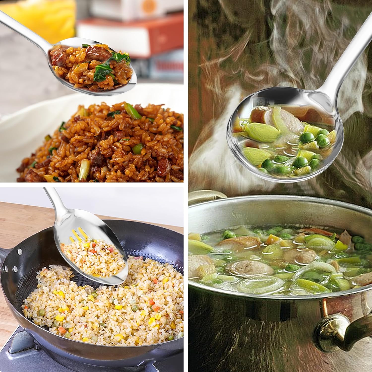 - HEAVY DUTY COOKING UTENSIL SET - This stainless steel cooking spoon set has thick and long handle and good heat insulation. That makes us feel comfortable to use them. And