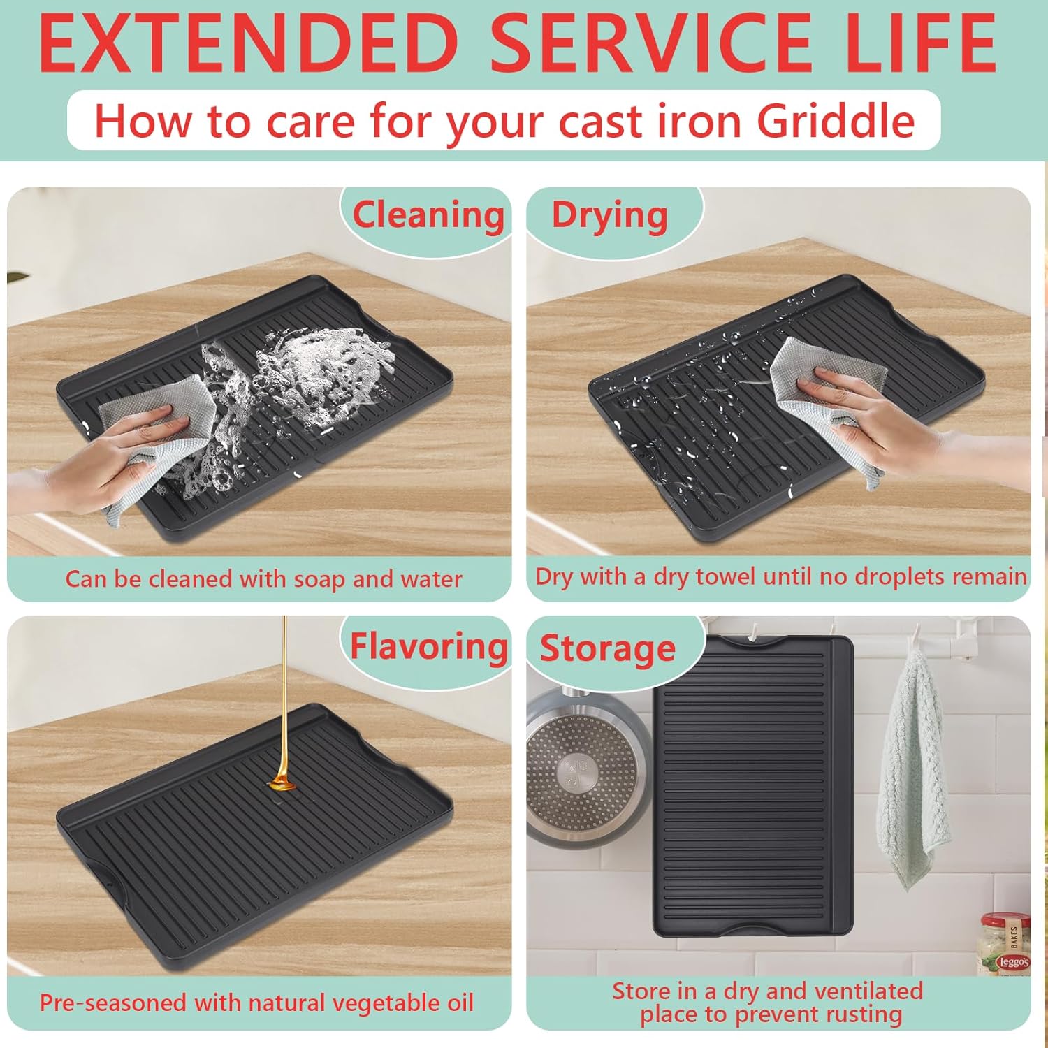 - What you get: 1 pack of griddle pan,Made of high quality cast iron,Dimensions: 24"L X 16"W,Please check the size you need before ordering! (Tip: After cleaning, please dry the skillet immediately with a towel or cloth, and then coat the surface of the skillet with cooking oil to prevent it from rusting)