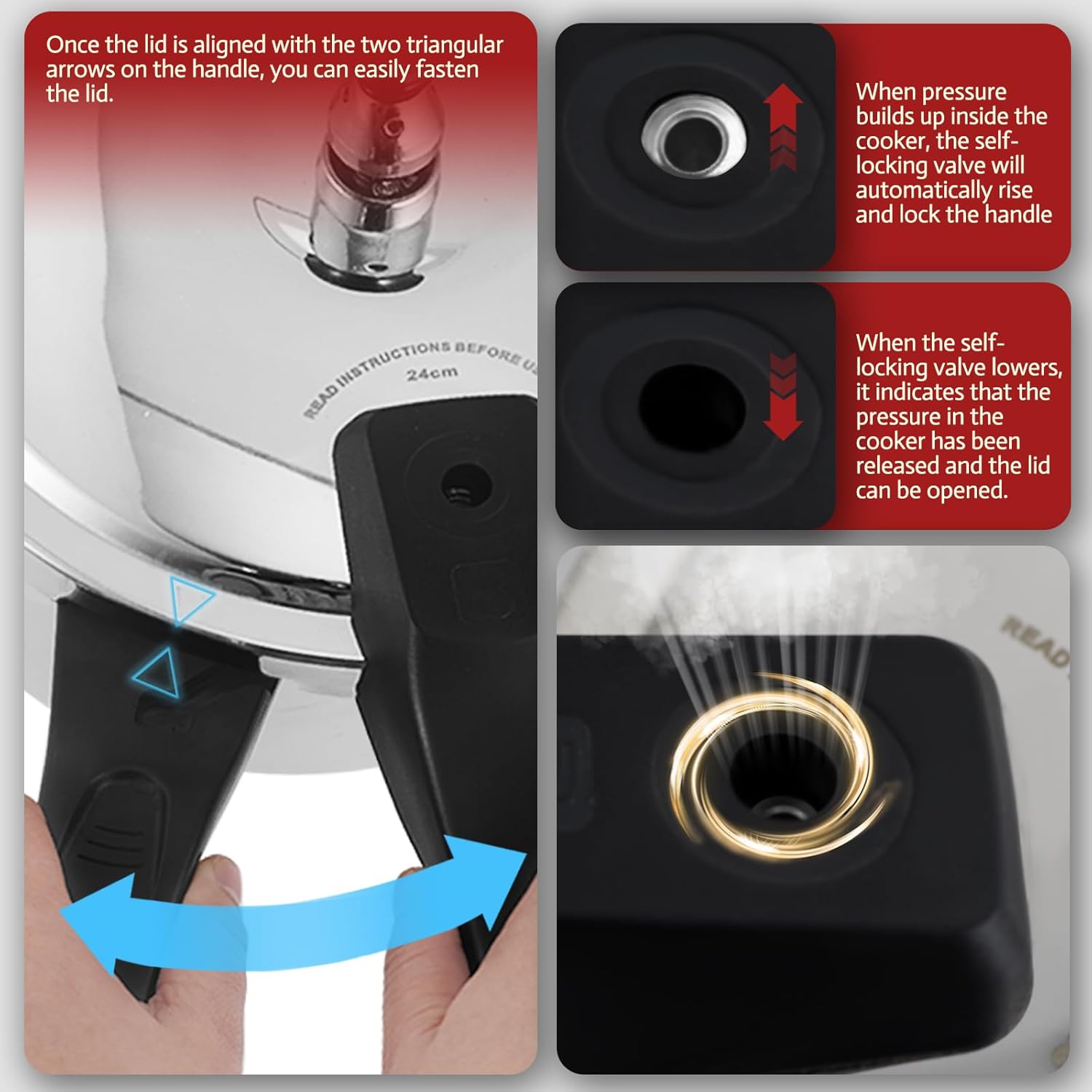 - โ [Advanced safety design]-Deeluban induction pressure cookers feature innovative automatic pressure-limiting valves, self-locking valves, safety valves and safety windows. The automatic pressure-limiting valve keeps the pressure at optimal levels during cooking; When sufficient pressure builds inside the cooker, the central rod of the self-locking valve rises, and once the pressure is released, the rod lowers, allowing the lid to be opened; If the internal pressure exceeds the safety limit, the safety window automatically releases the pressure.
