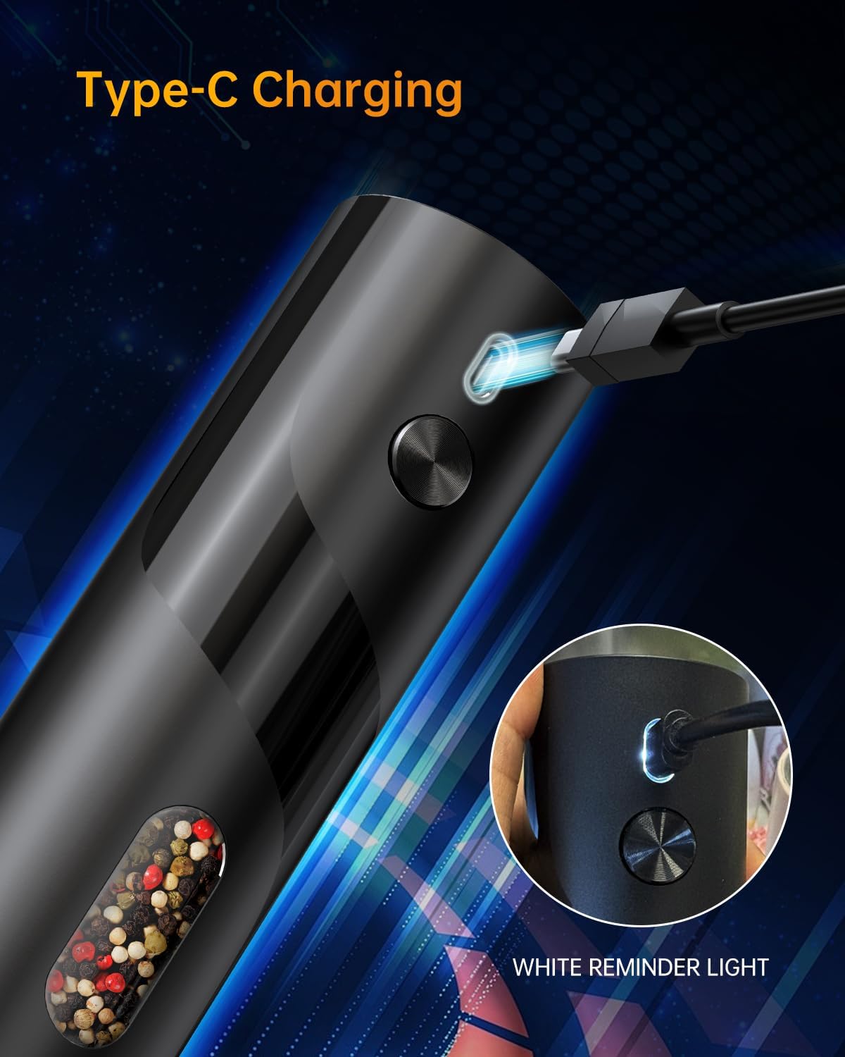 - Upgraded Large Capacity - Now 110ml (3.38 oz)—30% bigger than standard 70ml models—this grinder holds more spices, reducing refills. A built-in white LED light activates during grinding, letting you monitor the process in real time