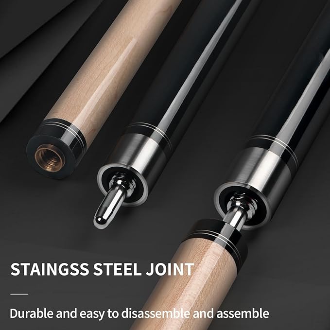• Professional Pool Cue: Kmise 58-inch 2-piece detachable pool cue, weight 20OZ, made of high-quality Canadian hard rock maple, stainless steel joints, sturdy and durable and not easy to deform