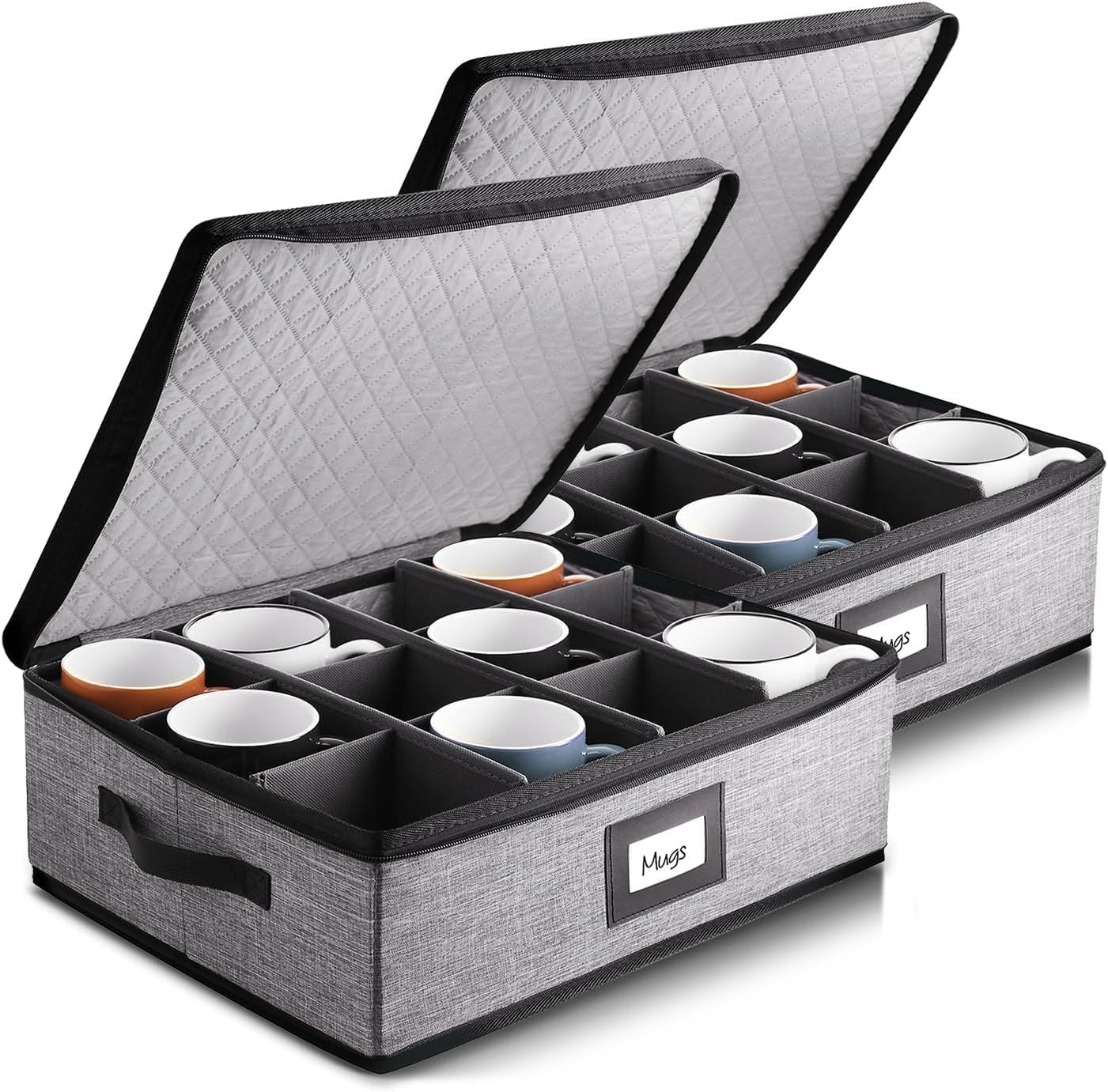 Coffee Mug Storage, 2 Pack Quilted and Stackable Coffee Cup Storage Organizer for Service of 12, Mug Storage Box with Dividers, Mug China Storage Containers Hard Shell for Moving and Seasonal Storage